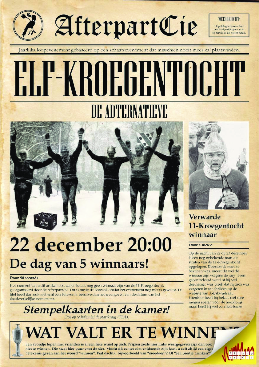 It gets colder, which means that its time for a pub crawl. Be there or be square, get your stamp card in the A-Eskwadraat common room in the week before christmas break.