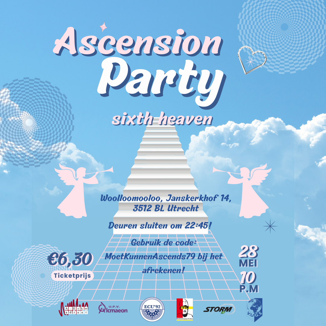 It's that time of the year again, get ready for our annual ascension party, a collaboration between A-Eskwadraat, U.P.V. Alcmaeon, ECU'92, Perikles, Storm, and V.U.G.S.! Join us for a heavenly time with loads of good music, dances, and fun!💃🕺