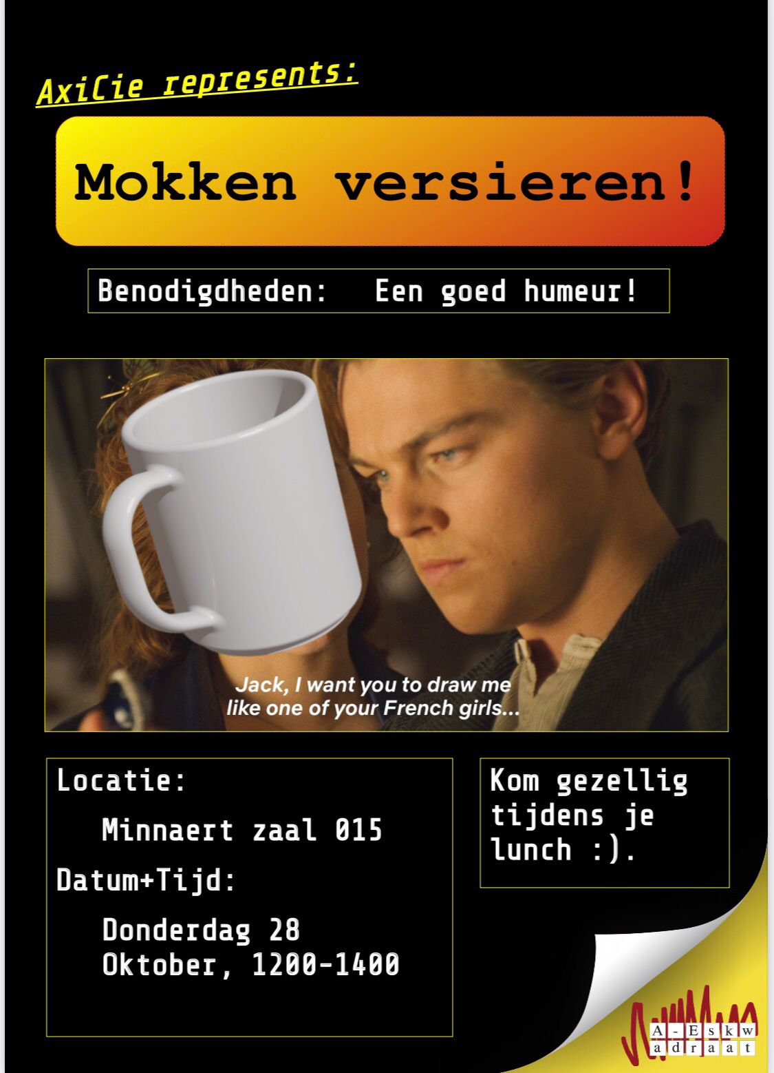 HAve you always wanted to use your artistic energy to decorate a mug to a fine piece of art? Come join us. You don't have to bring anything yourself and there are no entry costs. So come chill with us, decorate a mug and will put it on display in de room of A-Eskwadraat! (and ofcourse you can drink from it afterwards)