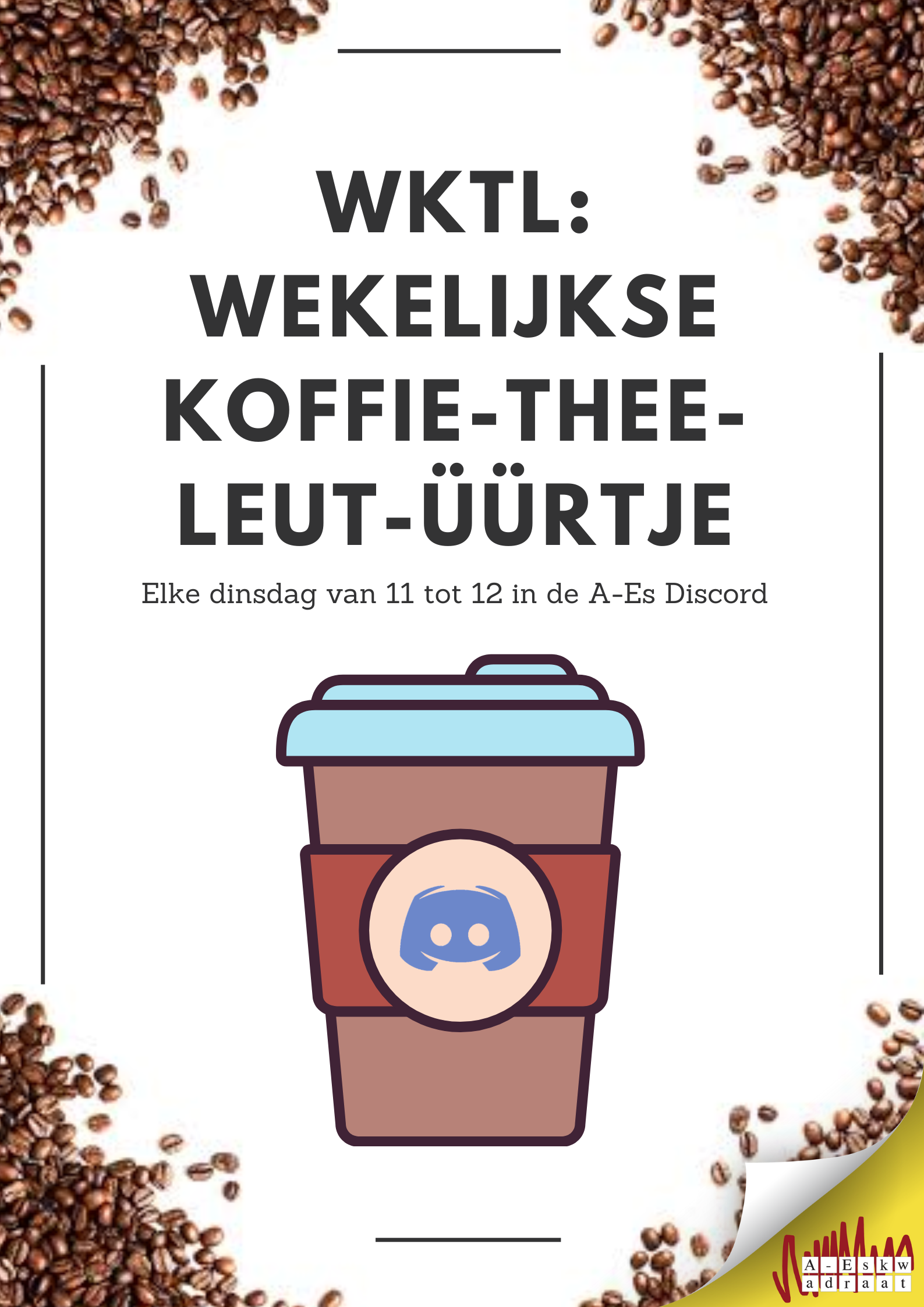 We cannot say it often enough, it are weird times and the board misses you. That is why we are now introducing the WCTL: the Weekly Coffee-Tea-Leut-Üürtje! In the coming weeks, the WKTL will be on the A-Es Discord every Tuesday from 11 to 12 (a-es2.nl/discord). Grab a cup of coffee, a cup of tea and, for those who love it, also a cookie and come and relax.