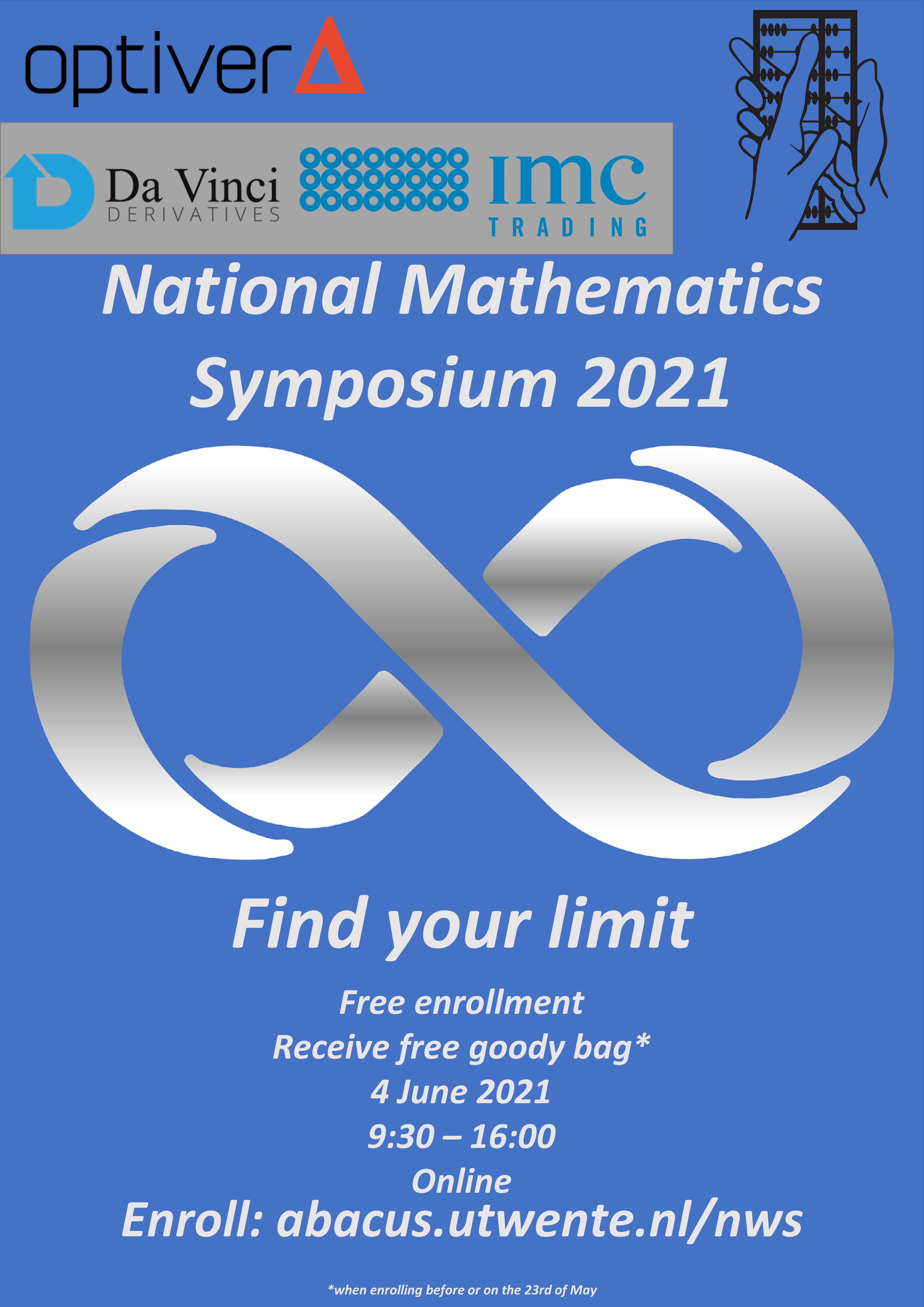 W.S.G. Abacus, the study association for Applied Mathematics at the University of Twente, annually organizes a symposium oriented on mathematics. This year we have the great honor of organizing a National Mathematics Symposium (NWS) (Nationaal Wiskunde Symposium). This NWS will take place online on Friday the 4th of June 2021. The theme of this year’s NWS will be “Find your limit”.
