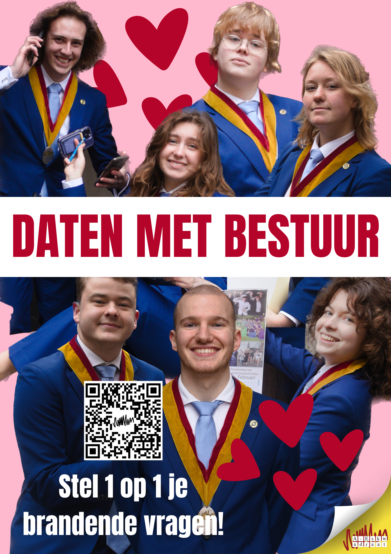 Dit is dé kans om te daten met iemand van het bestuur! Tussen 18 en 29 maart heb je de kans om VERLIEFD te worden op het doen van een bestuursjaar. Ga met je favoriete bestuurslid op date, stel alle vragen die je nog wilt stellen en praat over of een bestuursjaar iets voor jou is. Je kunt samen met het bestuurslid waarmee je op date gaat een moment ergens in deze twee weken inplannen.