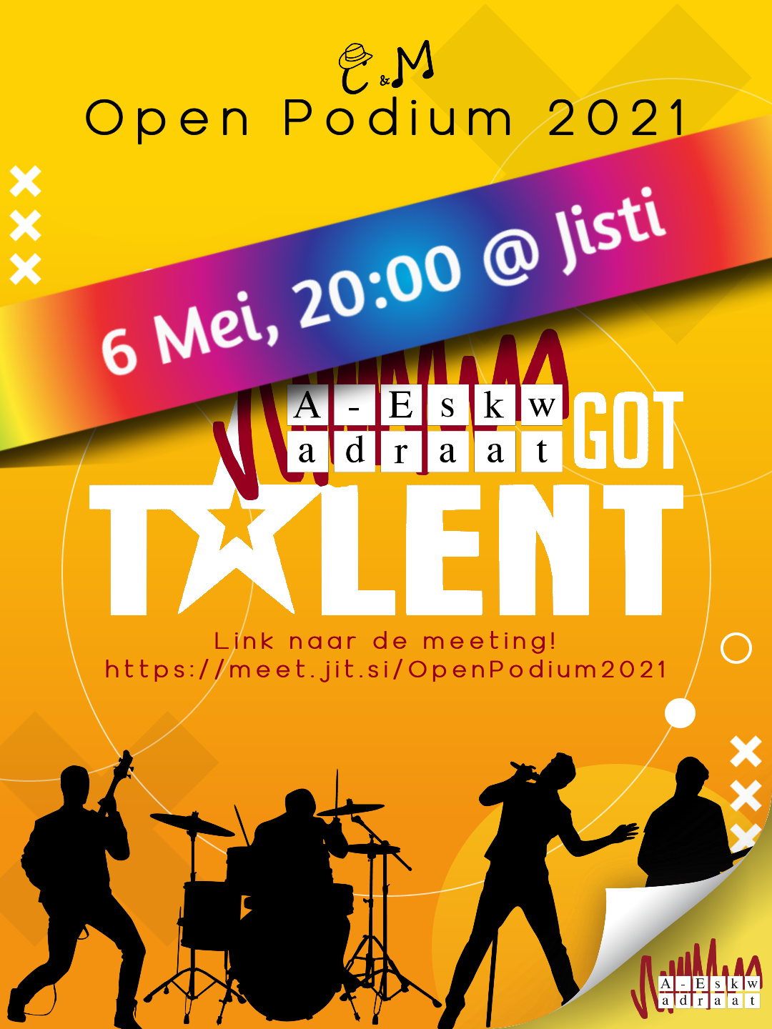 Are you a great musician? or do you have a passion for cabaret? Do you like to make sketches or are you a great magician? or do you have another talent (developed during the lockdown) that is not listed here yet? Then A-eskwadraat got Talent is the activity for you! Show your fellow students what you can do by participating in the open stage. Grab your camera, record yourself and send the video to us before May 5 via openpodium@a-eskwadraat.nl.