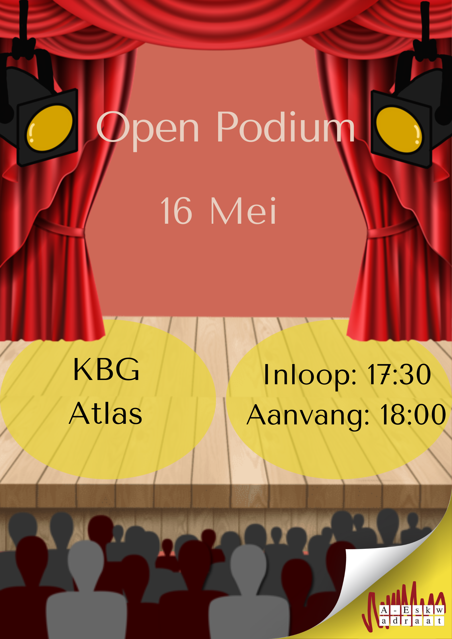 Hey Hey, het is weer tijd voor het Open Podium. Wil jij graag jou talent met de wereld delen, dan is dit je kans. Kun jij in moderne dans freestylen? Of heavy metal spelen op een blokfluit? Laat het dan zien op 16 mei vanaf in KBG Atlas. De inloop begint om 17:30 en de acts beginnen om 18:00. Je mag natuurlijk ook gewoon komen kijken.