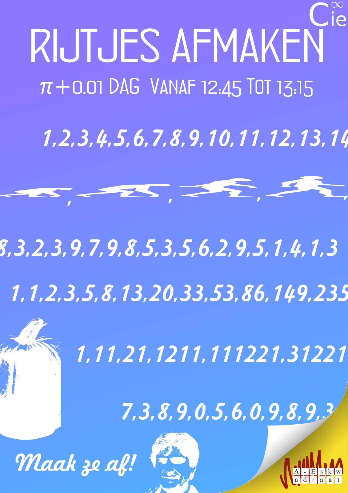 Kom je wel eens een rij getallen tegen, en vraag je je dan af, wat zou het patroon van deze rij zijn? Wees er dan zeker bij tijdens de wedstrijd rijtjes afmaken! Er zijn rijen met getallen, en als je kan bedenken wat een volgend getal kan zijn, kom dan langs! Er zijn meerdere antwoorden goed, en originaliteit wordt beloond!