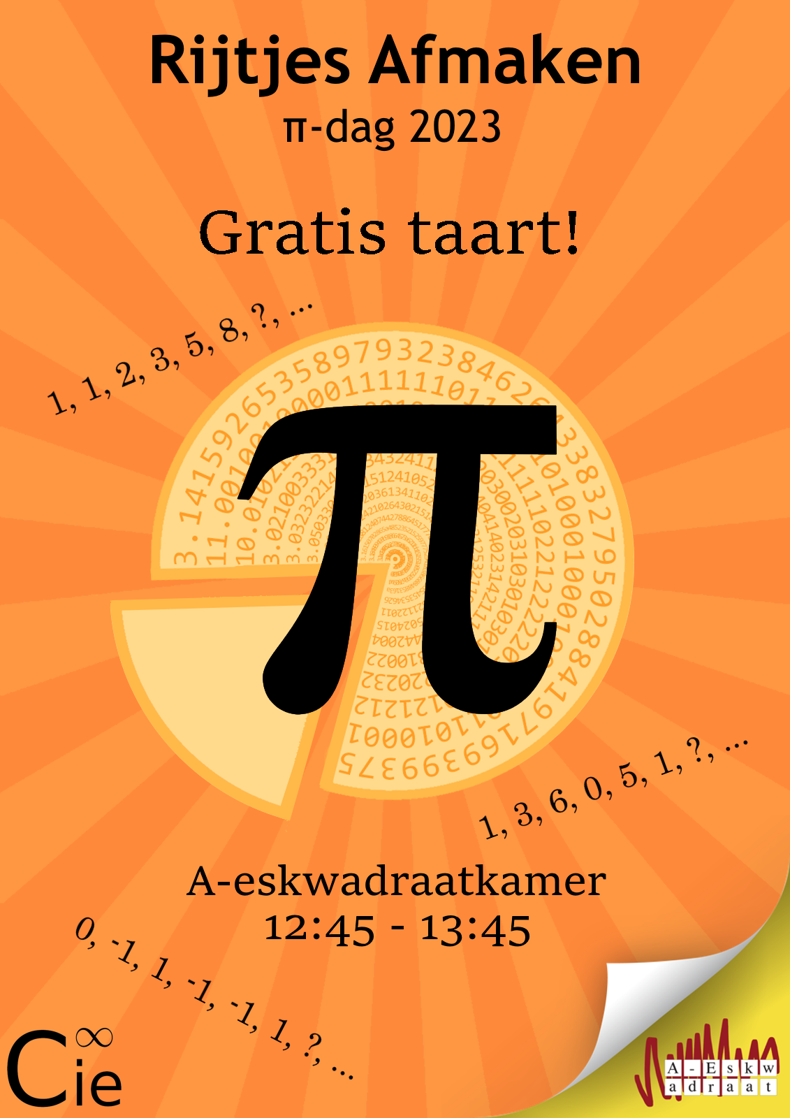 Kom jij wel eens een rijtje tegen, en vraag jij je dan af wat de volgende term zou kunnen zijn? Lust jij taart? Kom dan je patroon-zoekende hersenen uitdagen bij de activiteit Rijtjes Afmaken van de Cie Infinity, op π-dag in de A-Eskamer! Creativiteit wordt beloond (met taart [er is taart.])