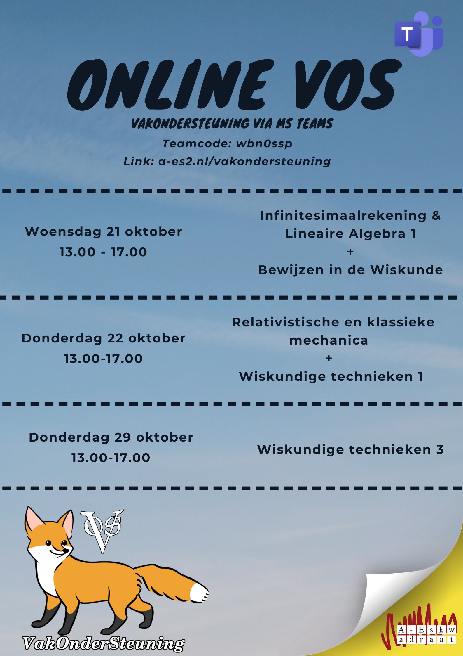 The end of the period is approaching, but unfortunately also the first exam week. Are you taking the course relativistische en klassieke mechanica and/or wiskundige technieken 1? Could you use some more help? Then A-Eskwadraat is there for you! We organize a VOS: VakOnderSteuning. Senior students are present this afternoon who can help you!
