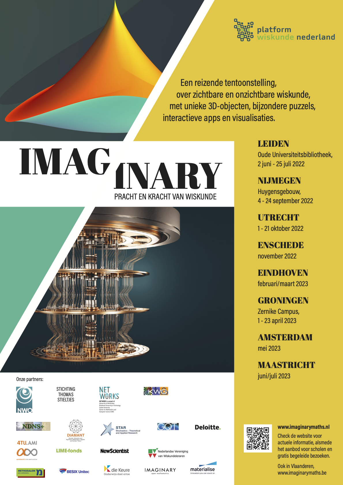 Van 1 tot 21 oktober is er de tentoonstelling Imaginary te bezoeken in de hal van het Minnaertgebouw. Dit is een rondreizende tentoonstelling, die de komende tijd in Utrecht zal zijn! De tentoonstelling gaat over zichtbare en onzichtbare wiskunde. De volgende lezingen zullen gegeven worden: