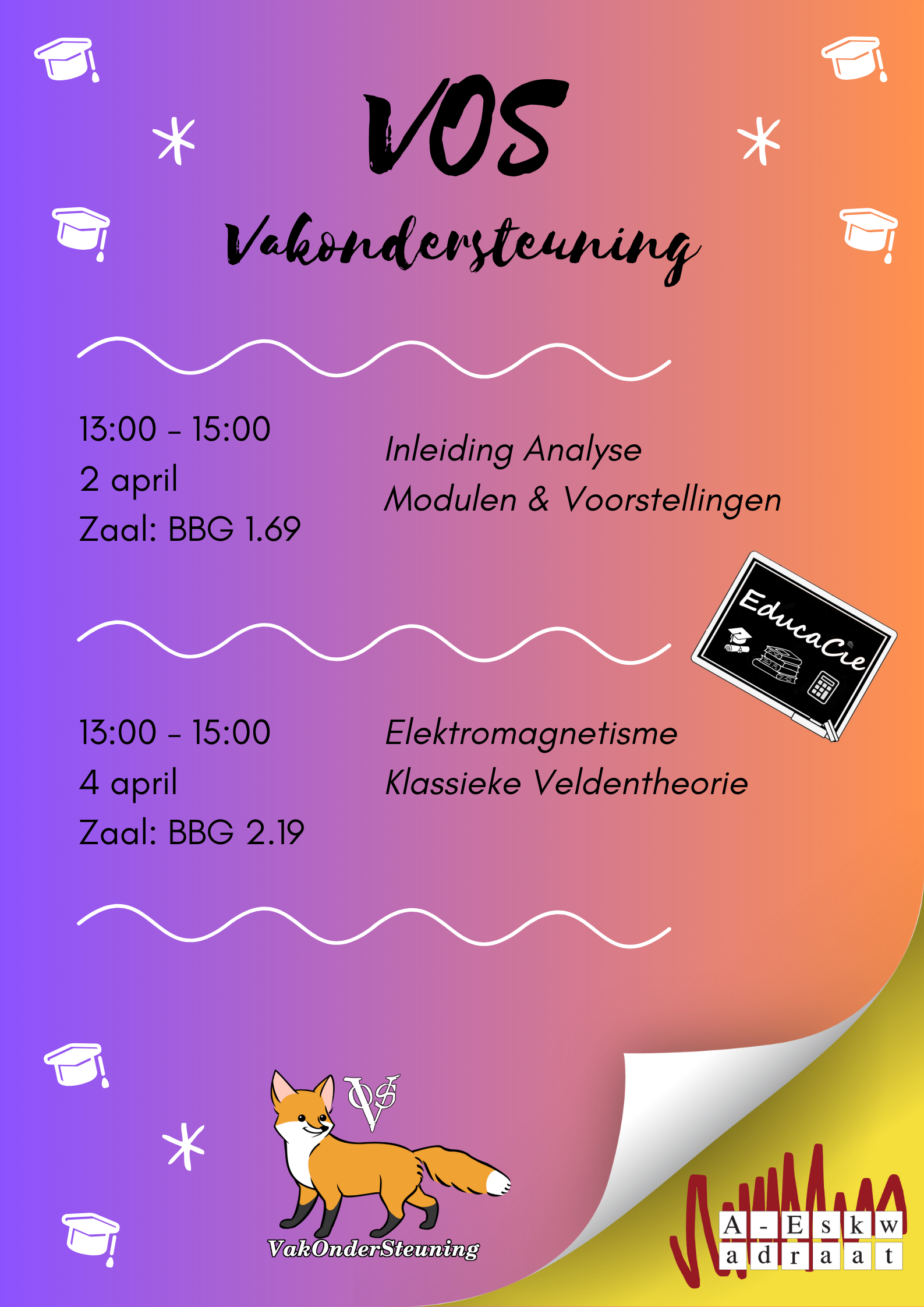 Volg jij dit blok één van de vakken Elektromagnetisme of Klassieke Veldentheorie en kan je nog dat kleine beetje hulp gebruiken voor je tentamenvoorbereiding? Kom dan 4 april naar de Vak Ondersteunende Sessie! Je kunt hier onder het genot van een heerlijk kopje koffie of thee en koekjes nog een laatste oefententamen maken of gewoon al je opgespaarde vragen uit de colleges stellen aan de ouderejaars begeleiders!