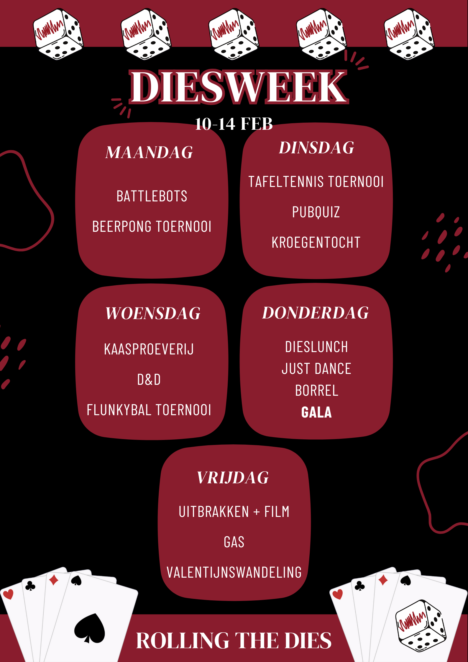 Van battlebots bouwen, tot kaas proeven, DnDies, of een pubquiz, deze week is er genoeg te beleven! Op 13 februari zal het hoogtepunt van de week plaatsvinden: het jaarlijkse Diesgala! 💃🏼🕺🏼🪩  Schrijf je snel in of koop een kaartje voor de activiteiten waar jij bij wil zijn!