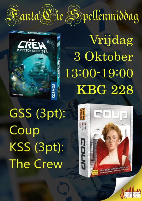 Vrijdag is het zover de tweede spellenmiddag van dit jaar; We gaan coup en crew spelen. Daarnaast begint ook het GrootSpellenSpel (GSS).
