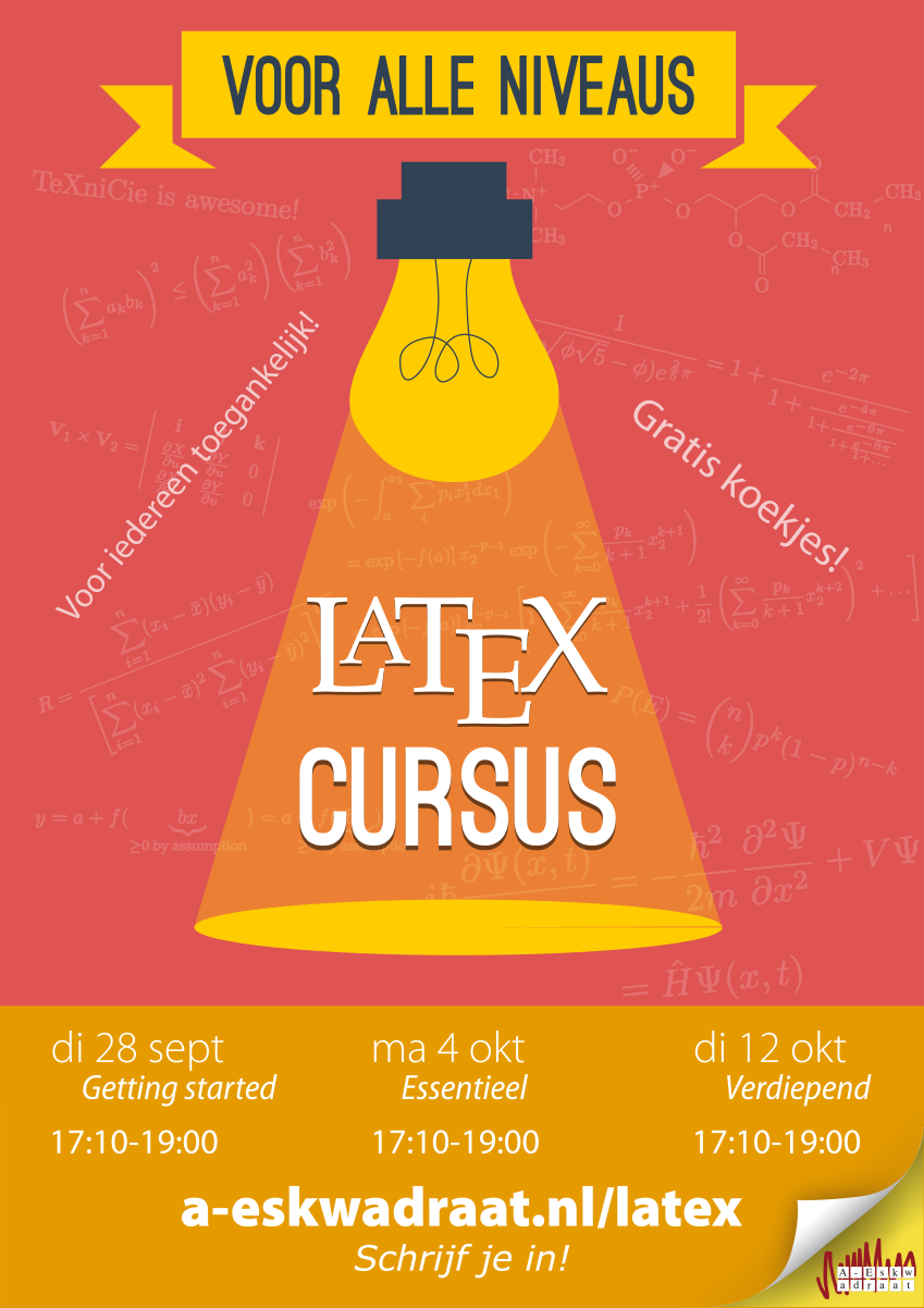 Van 28 september tot 4 oktober loopt de LaTeX-cursus van A-Eskwadraat, georganiseerd door de TeXniCie commissie. De cursus is op locatie, vergeet je dus niet in te schrijven met de link beneden! Je kan je inschrijven tot vlak voor elke sessie, maar schrijf je op tijd in zodat je geen enkel informatiemailtje mist!