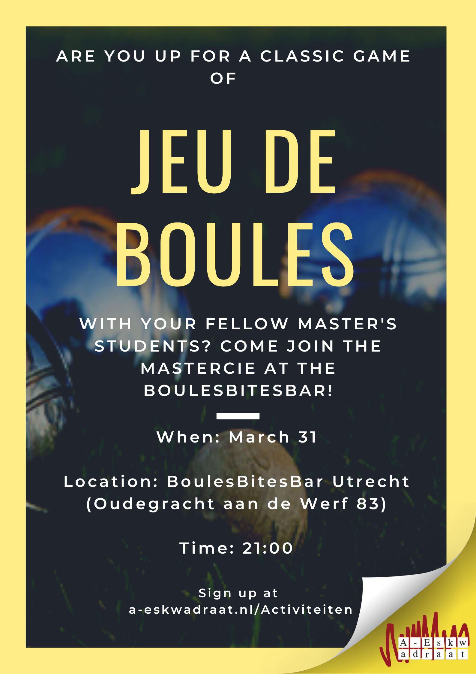 Are you up for a classic game of jeu de boules with your fellow master students? Come join the MasterCie at the BoulesBitesBar (Oudegracht aan de Werf 83) on March 31st. We start at 21:00. Sign up at a-eskwadraat.nl/Activiteiten.