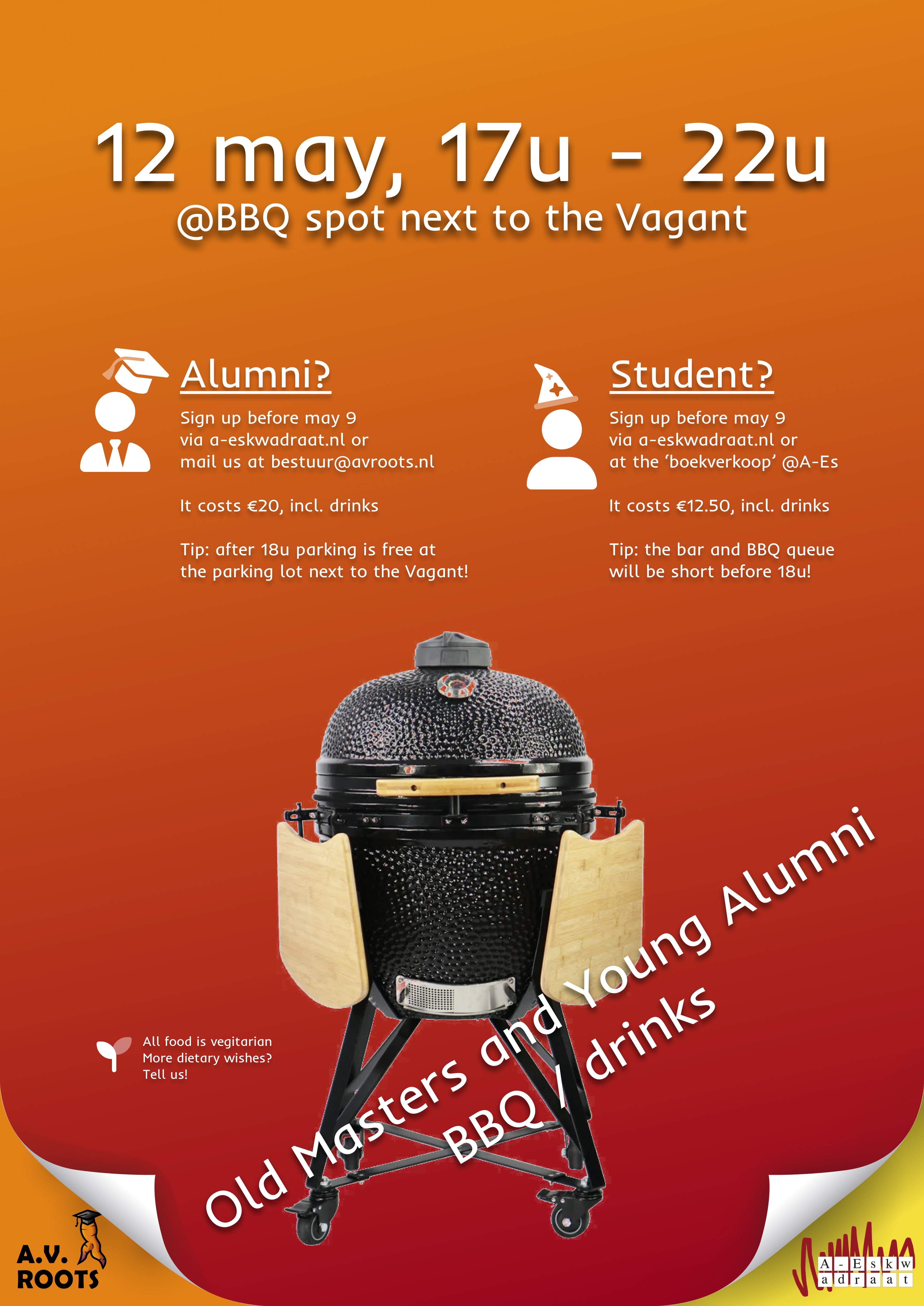 Come and celebrate the spring with us on May 12 with a BBQ and drinks at the Uithof! Come for the beer, the corn on the cob, the sun, your friends or maybe an interesting conversation. Both 'Old' Masters and 'Young' Alumni are invited. Talk to others about what you will do after your studies / current crappy job, or just come to (re-)experience your student life!
