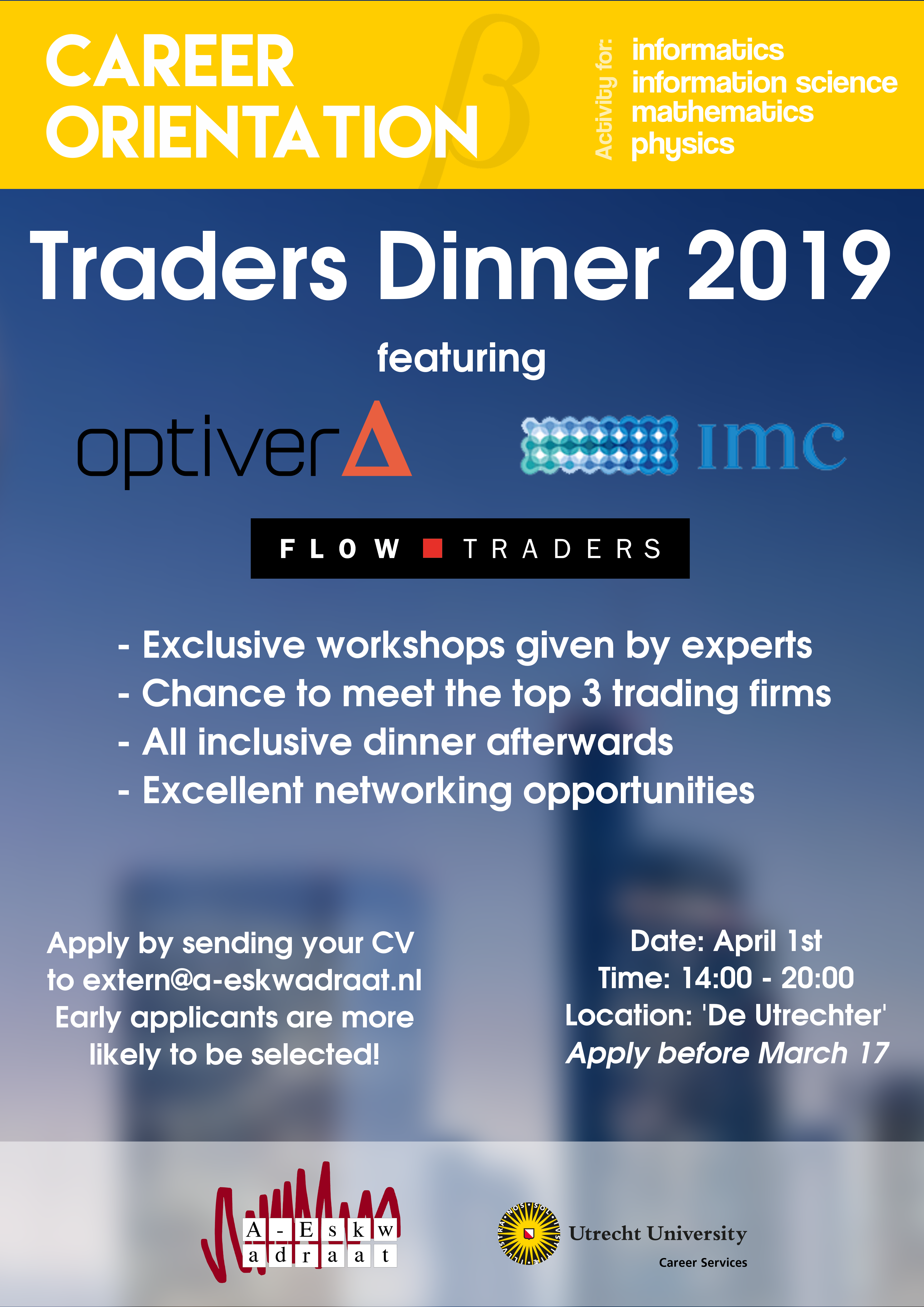 In order to give a better view of this poorly understood field, we are organising the Traders Dinner with the three largest traders of the Netherlands: Optiver, Flow Traders and IMC.