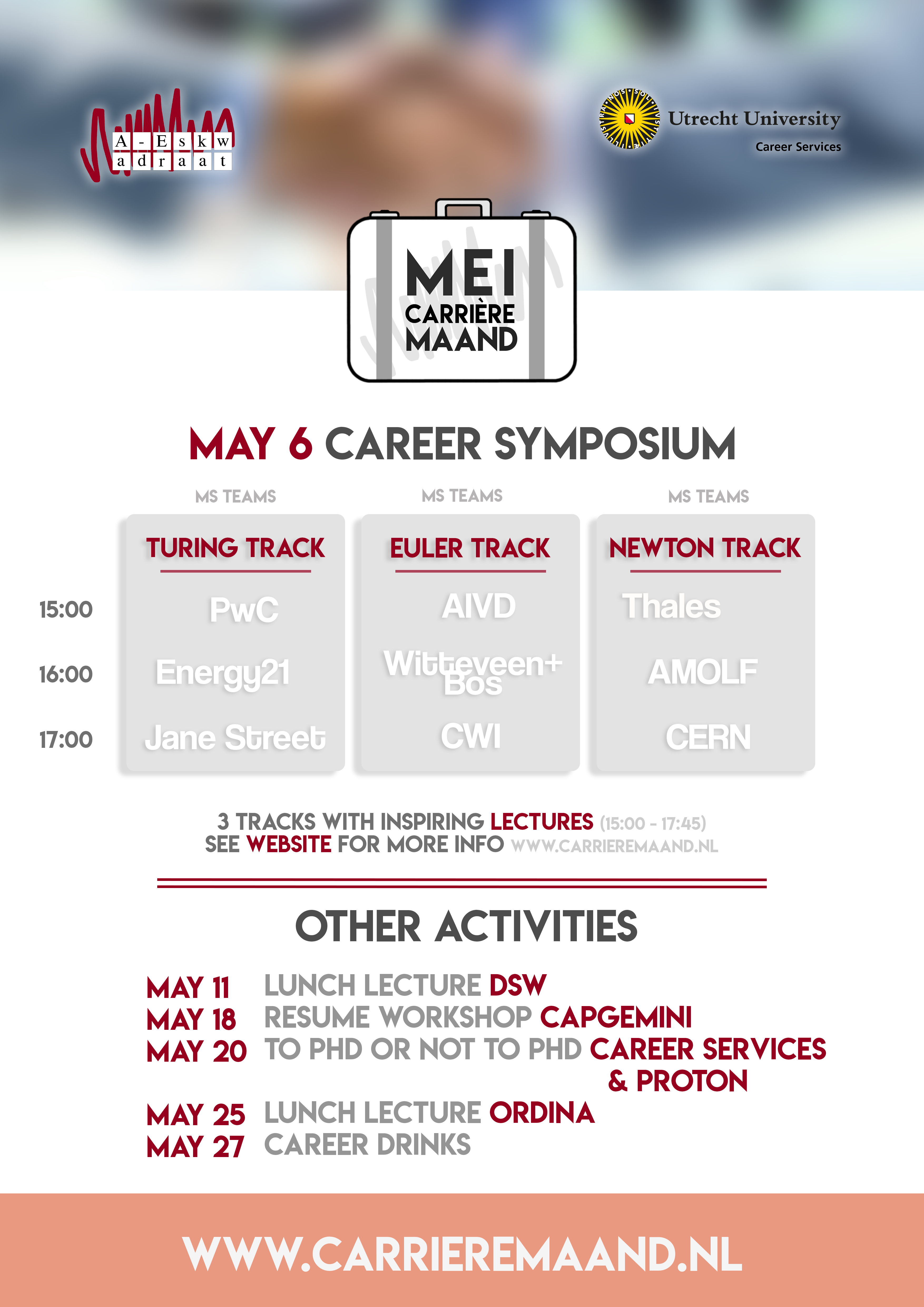 The opening of the Career Month: a symposium focused on Career Orientation! There will be parallel sessions focused on Information/Computing Science (Turing Track), Physics (Newton Track) and Mathematics (Euler Track). Everybody is welcome at every session. This year's programme can be viewed below. The link to join the session will follow later.