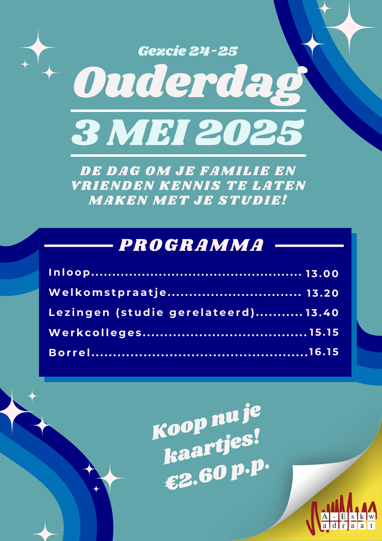 De ouderdag is dit jaar op 3 mei in de middag en het programma zal onder andere een hoorcollege en een werkcollege bevatten. De dag zullen we gezamelijk afsluiten met een borrel!