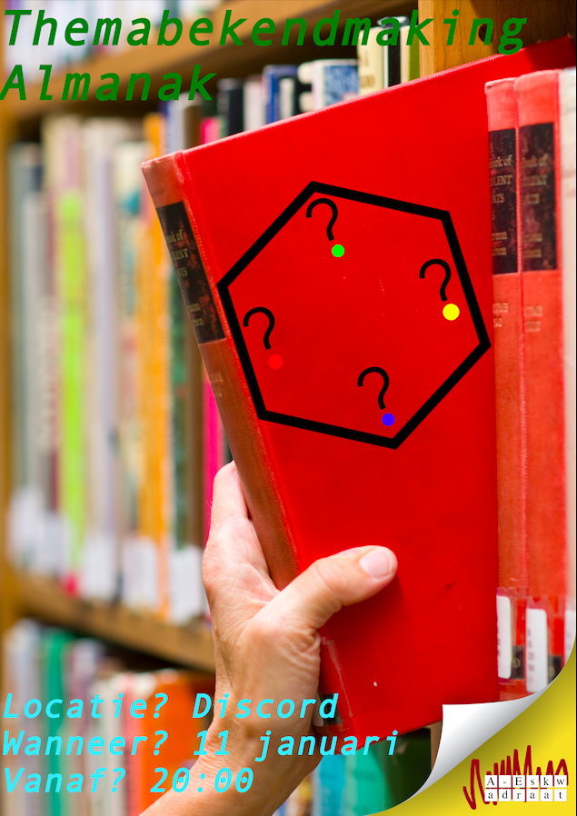 Dit colllegejaar zal de eerste almanak uitkomen sinds 2015! Bij een almanak hoort natuurlijk een thema en die zullen we maandag 11 januari bekendmaken. Dus als je na je eerste collegedag van het nieuwe jaar al meteen uitgeput bent kom dan vooral langs. We zullen dit doen op discord door middel van een filmpje. Wees er wel echt op tijd bij want het filmpje is niet heel lang. We zullen beginnen om 20:10. Na het filmpje zal er ook een Kahoot komen. Dus als je wat bragging rights wilt, moet je ook komen!