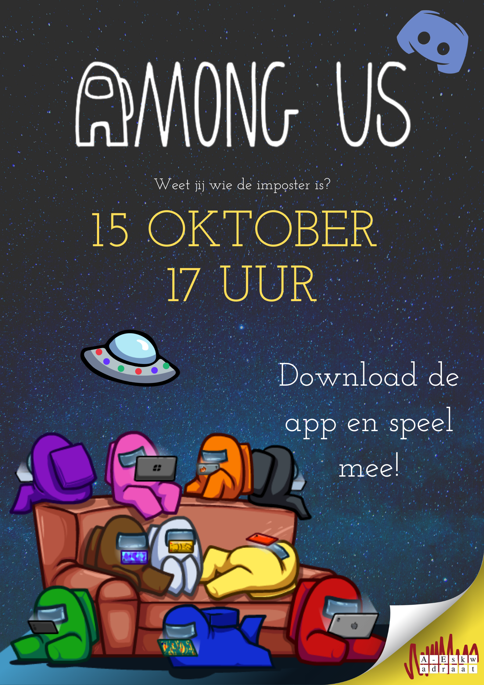 Ken jij de nieuwe hype al?? Het heet 'Among Us'! Het is DE perfecte game om te spelen met vrienden nu iedereen thuis zit. Neem het in de discord (a-es2.nl/discord) op tegen elkaar en ontdek wie het spel probeert te saboteren!