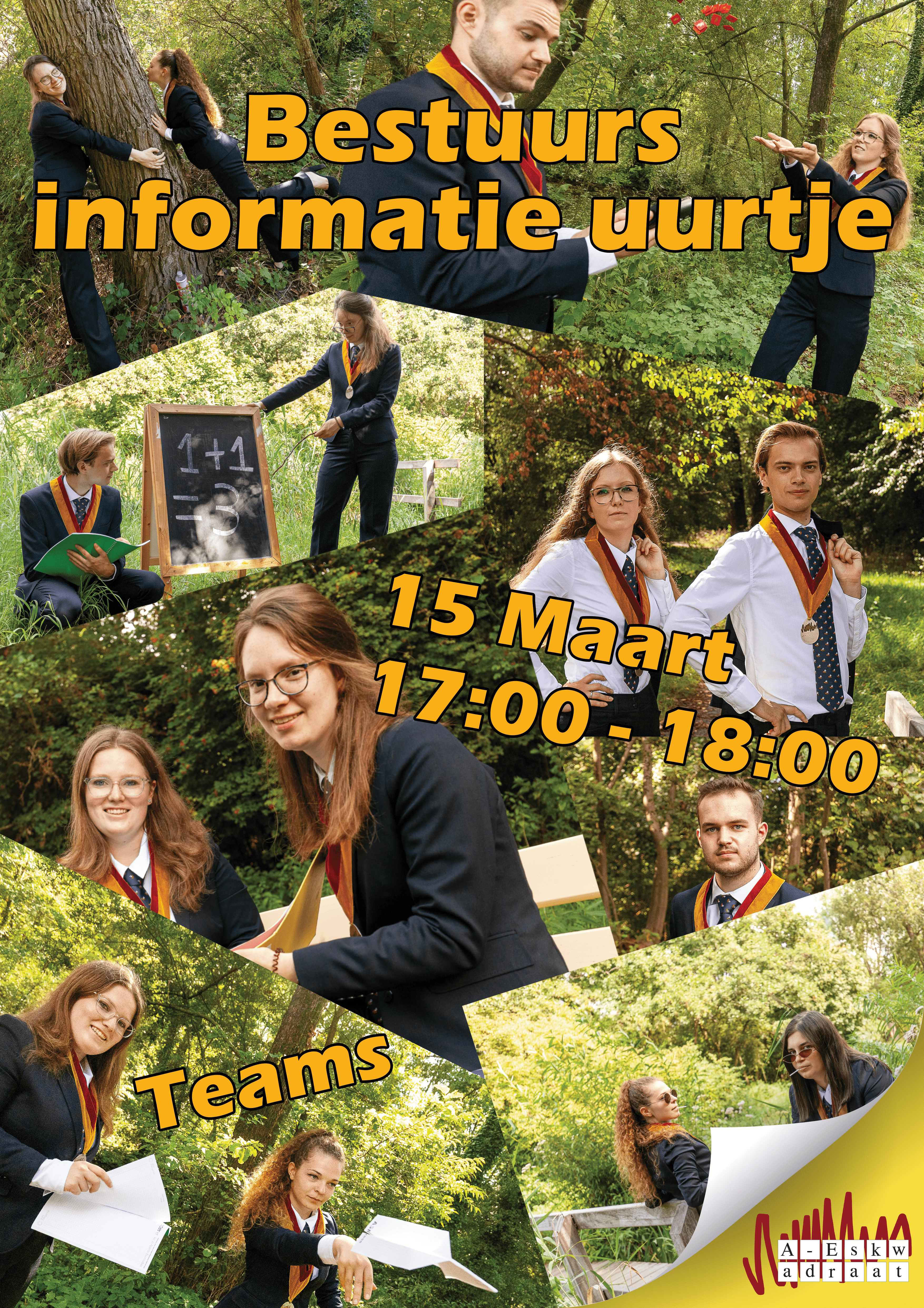 Ben je nou benieuwd wat een bestuur nou precies uitspookt op een dag, wil je weten wat je kan leren en kan verwachten tijdens een bestuursjaar? Kom dan vooral even digitaal langs bij het bestuurs informatie uurtje, waarin meerdere (oud) bestuursleden hun ervaringen delen, en waar natuurlijk ook genoeg tijd is om alle vragen te stellen die je maar wilt. Hopelijk tot dan!