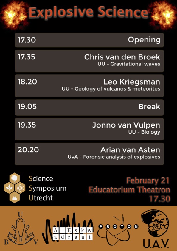 The Science Symposium Utrecht "Explosive Science" will take place on February 21 from 5:00 PM to 8:30 PM in the theatron in the Educatorium at the Utrecht Science Park. Various speakers will talk about the many different forms of Explosive Science within the disciplines of biology, chemistry and physics.