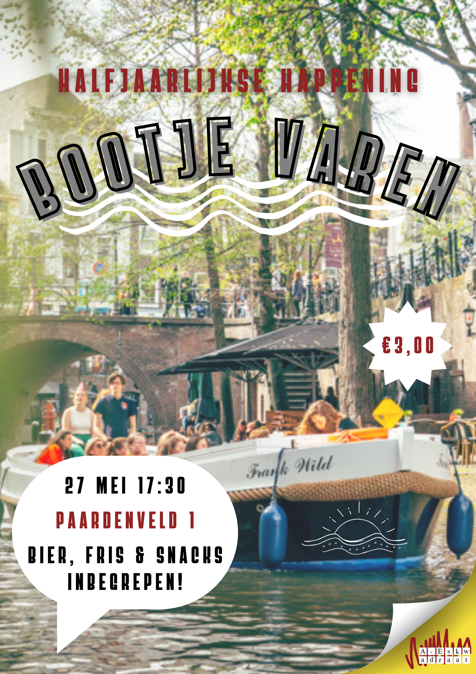 Het is tijd voor de tweede Halfjaarlijkse Happening. Deze keer gaan we met een sloepje de grachten van ons prachtige stadsie op. Kom jij met ons van het heerlijke zonnetje genieten? De boottocht zal 1,5 uur duren en bier, fris en snacks zijn inbegrepen bij de prijs!