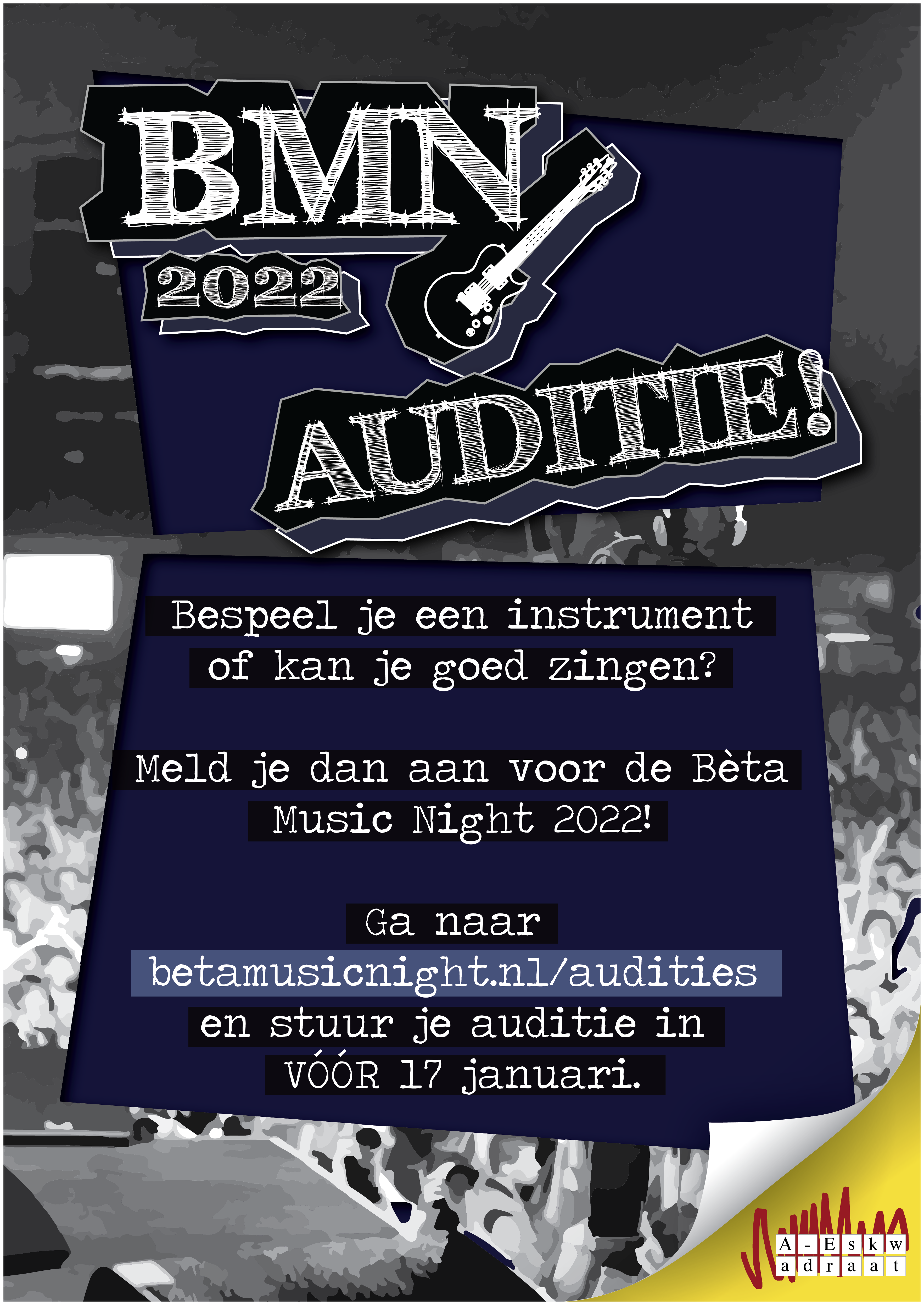 Bespeel jij een instrument of kan je goed zingen? Doe dan auditie voor de 2022ste editie van de BMN! Wat is de BMN? De Beta Music Night (BMN) is een muziekevenement aan het eind van het collegejaar waar een groep muzikanten een volle setlist aan flink geoefende covers opvoert in de Helling in Utrecht, en daar kan jij deel van uitmaken!