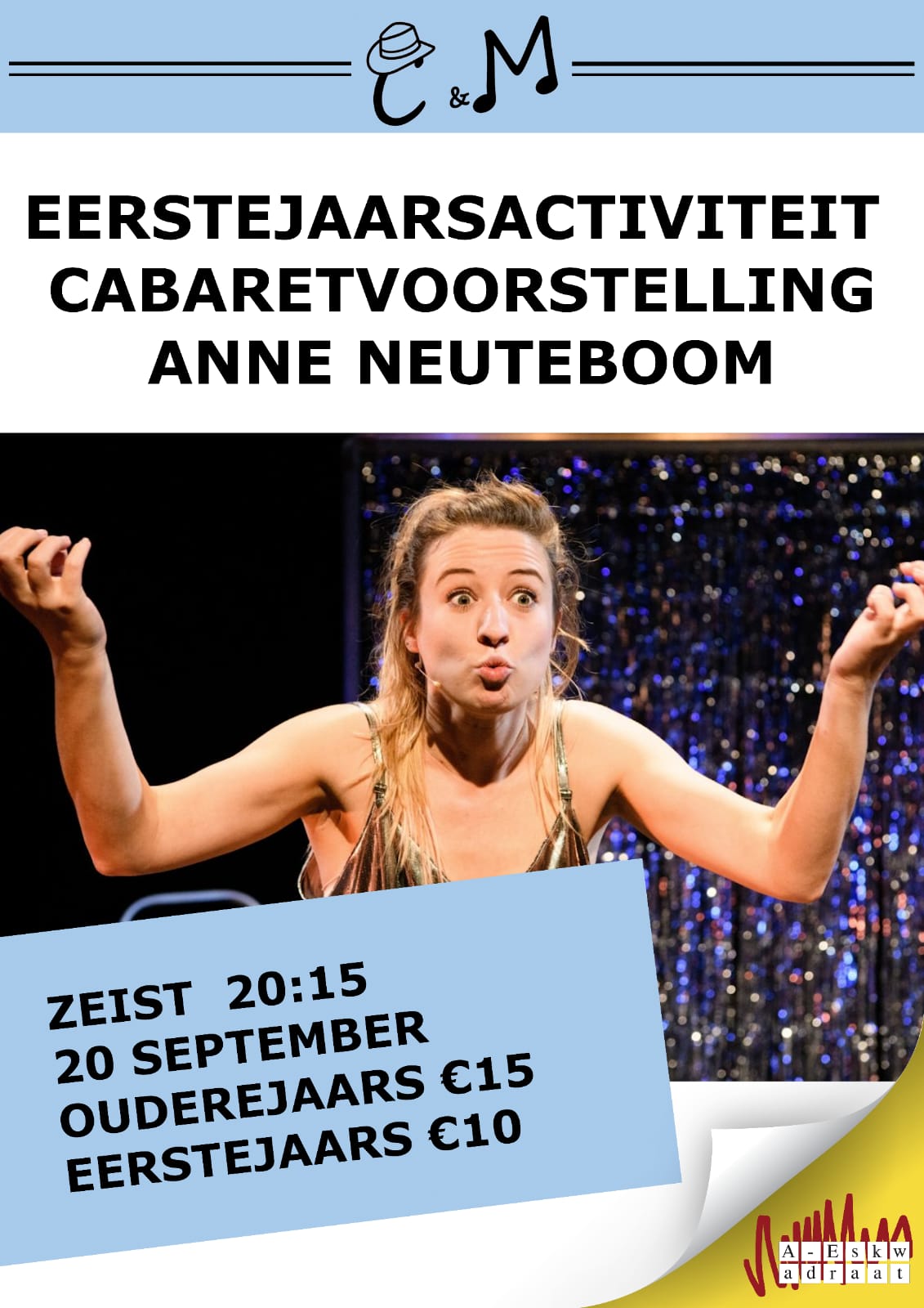 Namens de C&M deze activiteit, de cabaretvoorstelling van Anne Neuteboom! Met haar voorstelling "Kijk haar gaan" is ze genomineerd voor de prijs voor de theatermaker met het grootste toekomstperspectief. Nou, dat wordt dus een feest, en als je eerstejaars bent, kun je voor slechts €10 een kaartje halen bij de boekverkoop! Van tevoren kun je aansluiten bij het samen eten en reizen (OV). Tot dan!