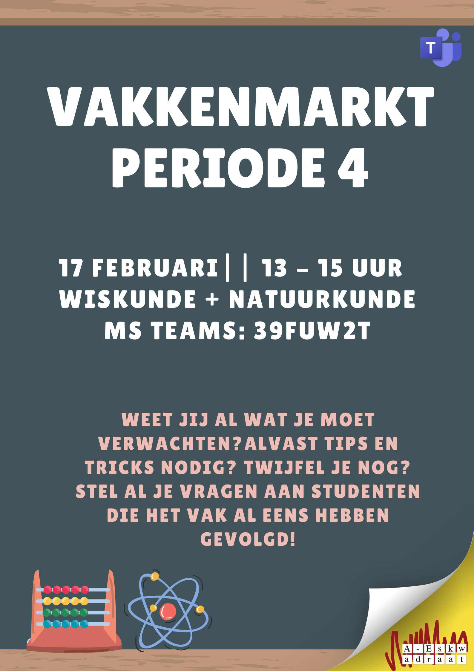 Kom dan 17 februari tussen 13 en 15 naar de vakkenmarkt. Er is vrije inloop! Het is gewoon lekker simpel via MS Teams vanuit huis. Word lid van de teams met de volgende code: 39fuw2t of via https://www.a-eskwadraat.nl/t/vakkenmarktwiskunde