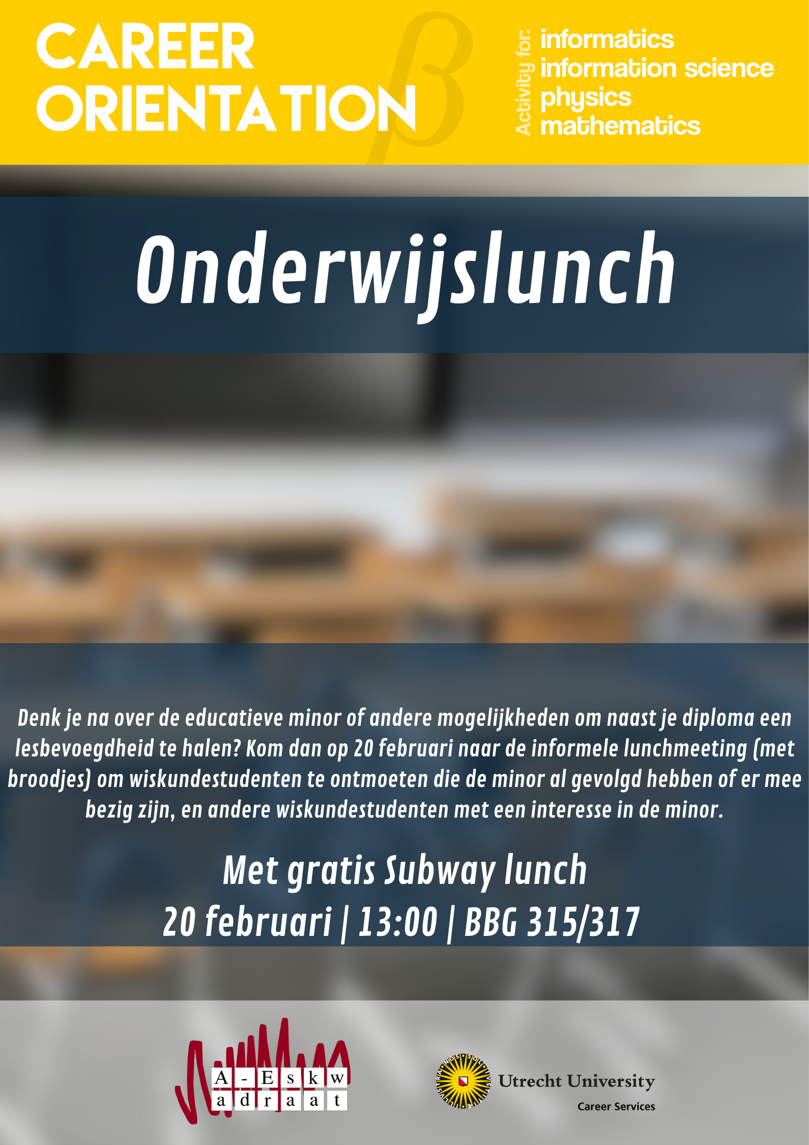 Are you thinking about the educational minor or other possibilities to get an educational accreditance alongside your diploma? Come to the informal lunch (including free lunch) meeting on the 20th of februari, to meet other students who did the educational minor or are doing the educational minor.