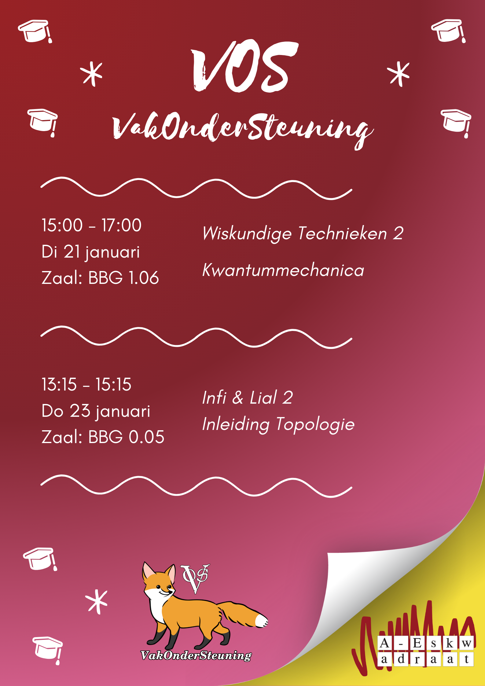Volg jij dit blok Infi&Lial 2 of Inleiding topologie? En kan je nog wel dat kleine beetje extra hulp gebruiken?? Kom dan naar de Vak Ondersteunende Sessie op 23 januari in BBG 0.05! Je kunt hier onder het genot van koffie/thee en koekjes en onder begeleiding van ouderejaars studenten nog een oud tentamen maken, en natuurlijk ook nog alle vragen stellen die je op hebt gespaard het hele blok :))