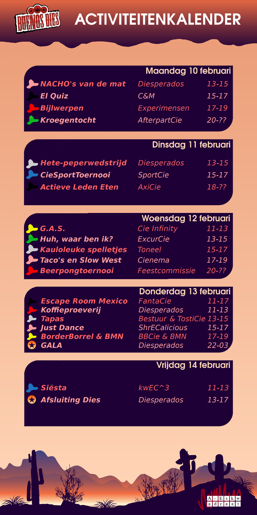 The Dies is the birthday of our study association. On the 10th of february, A–Eskwadraat will be 49 years old! 🎉 We will celebrate this by organising all sorts of activities in the week of 10-14 february. Be there or be square! The prom night will be on thursday the 13th of february, so be sure to write that in your agenda! 🥑
