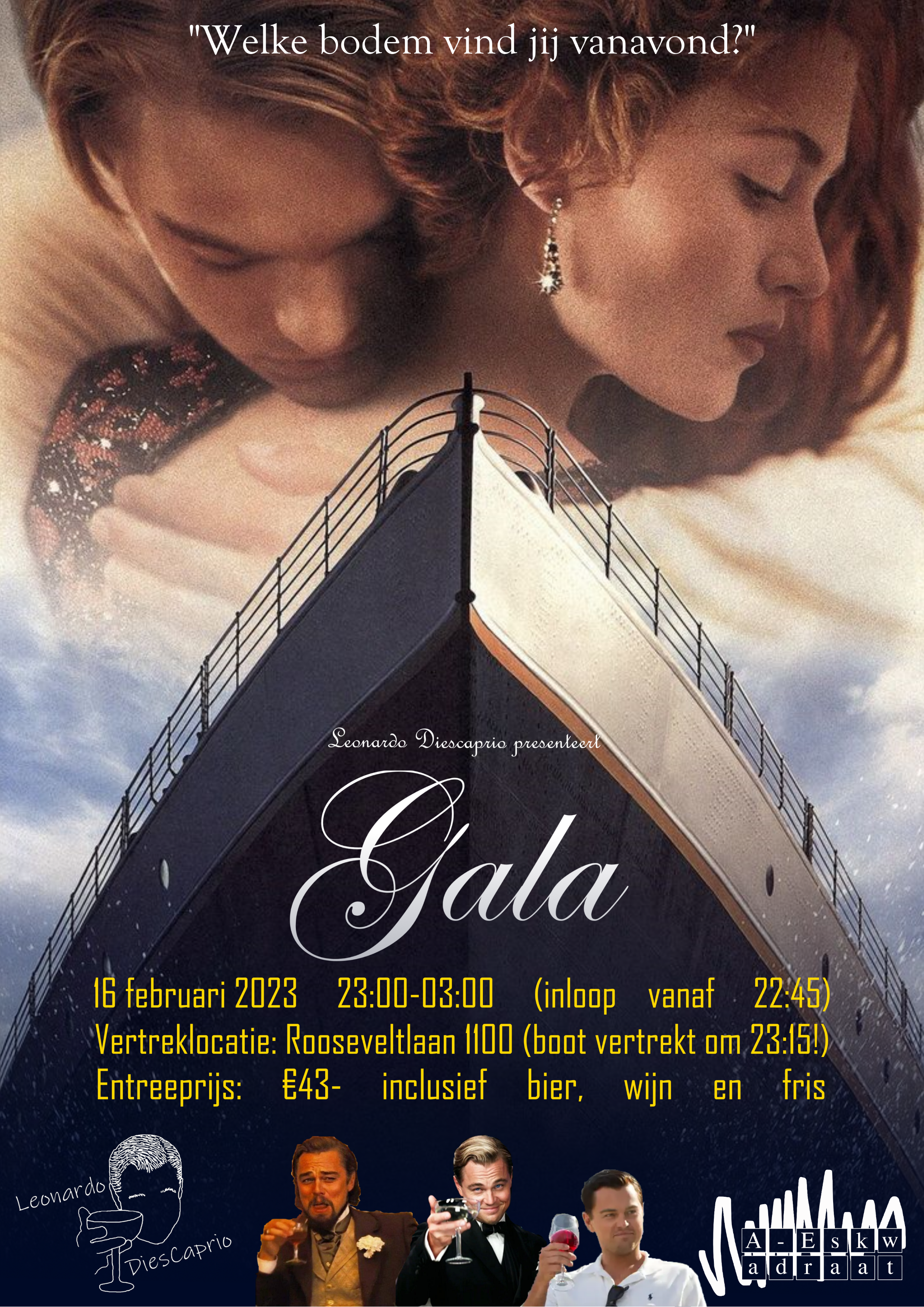 Het gala is dit jaar op Boot 10, dus we gaan varen tijdens het gala! De opstapplek is Rooseveltlaan 1100. De boot gaat varen tussen 23:15 en 03:00 met een tussenstop voor het geval dat je eerder van de boot af wil. De inloop is vanaf 22:45. De boot vaart om 23:15 WEG, dus zorg dat je er op tijd bent!!! Neem je iemand van buiten A-Eskwadraat mee? Zorg er dan voor dat je een extra kaartje koopt. Goed om te weten: er is onbeperkt bier/fris/wijn bij de prijs inbegrepen :)