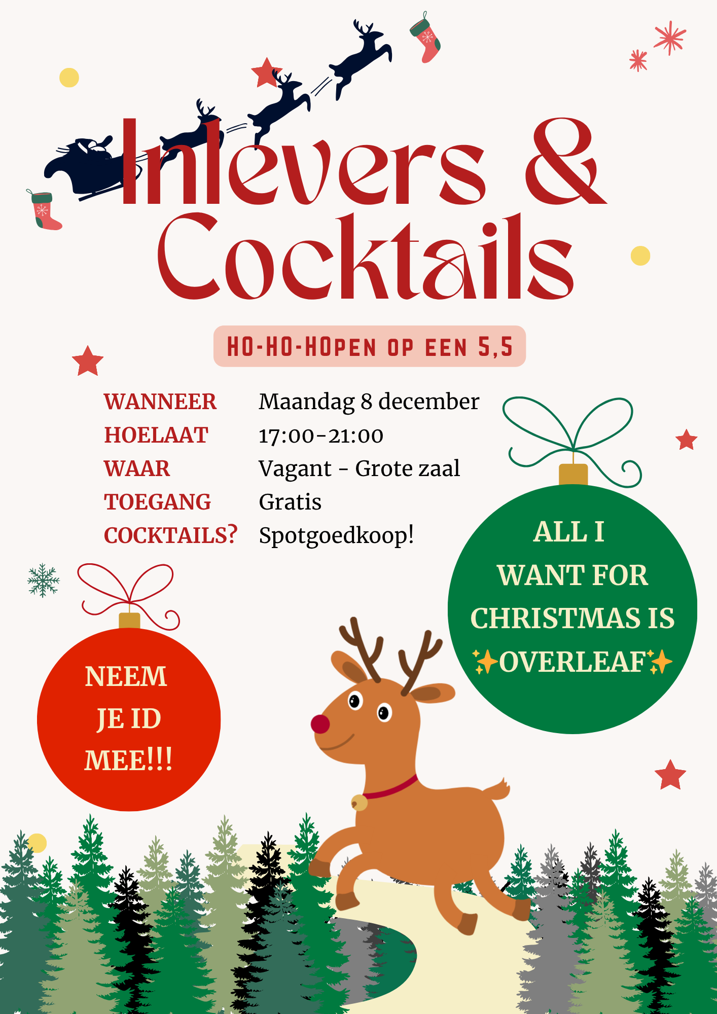 Herken jij je misschien lichtelijk in dit eerlijke beeld van de met-deadlines-gebombardeerde student? Heeft professor Vonk zojuist jouw gemiddelde avond beschreven? Tijd om dit te verbeteren! Biologisch onderzoek heeft uitgewezen dat de deadline-strijder een echt groepsdier is, en daarom gaan we samen aan onze inlevers bij deze geweldige activiteit! Vervang je pasta pesto voor heerlijke kerstsnacks, je rommelige studentenkamer voor de gezellige vagant & kerstlichtjes, en je thermoskan koffie voor spotgoedkope cocktails!!! De kerstman heeft zijn to-do lijstje al af, nu jij nog! Dan komt hij je vast goede cijfers brengen op 25 december!