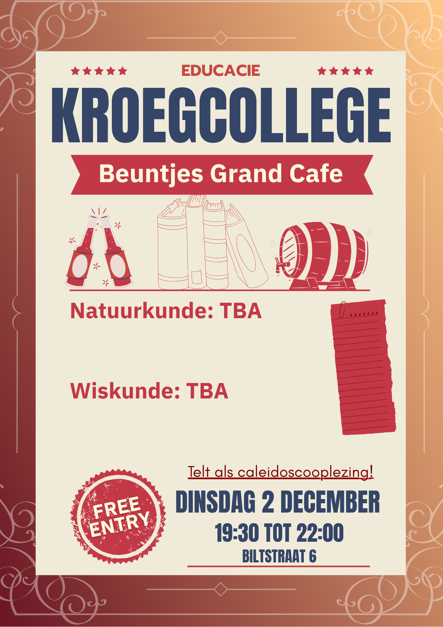 Gelukkig staat de educacie voor jullie klaar om deze saaie colleges om te toveren tot iets geweldigs; kroegcolleges! Stukken korter dan je lange lectures, niet in een kille ruppert-zaal maar een gezellig cafe in de stad, en vervang slechte automaatkoffie maar voor een heerlijk biertje of drankje! En als kers op de taart krijg je hier geen tentamen over, weg met die stress! Dit wil je natuurlijk niet missen, dus schrijf je snel in!