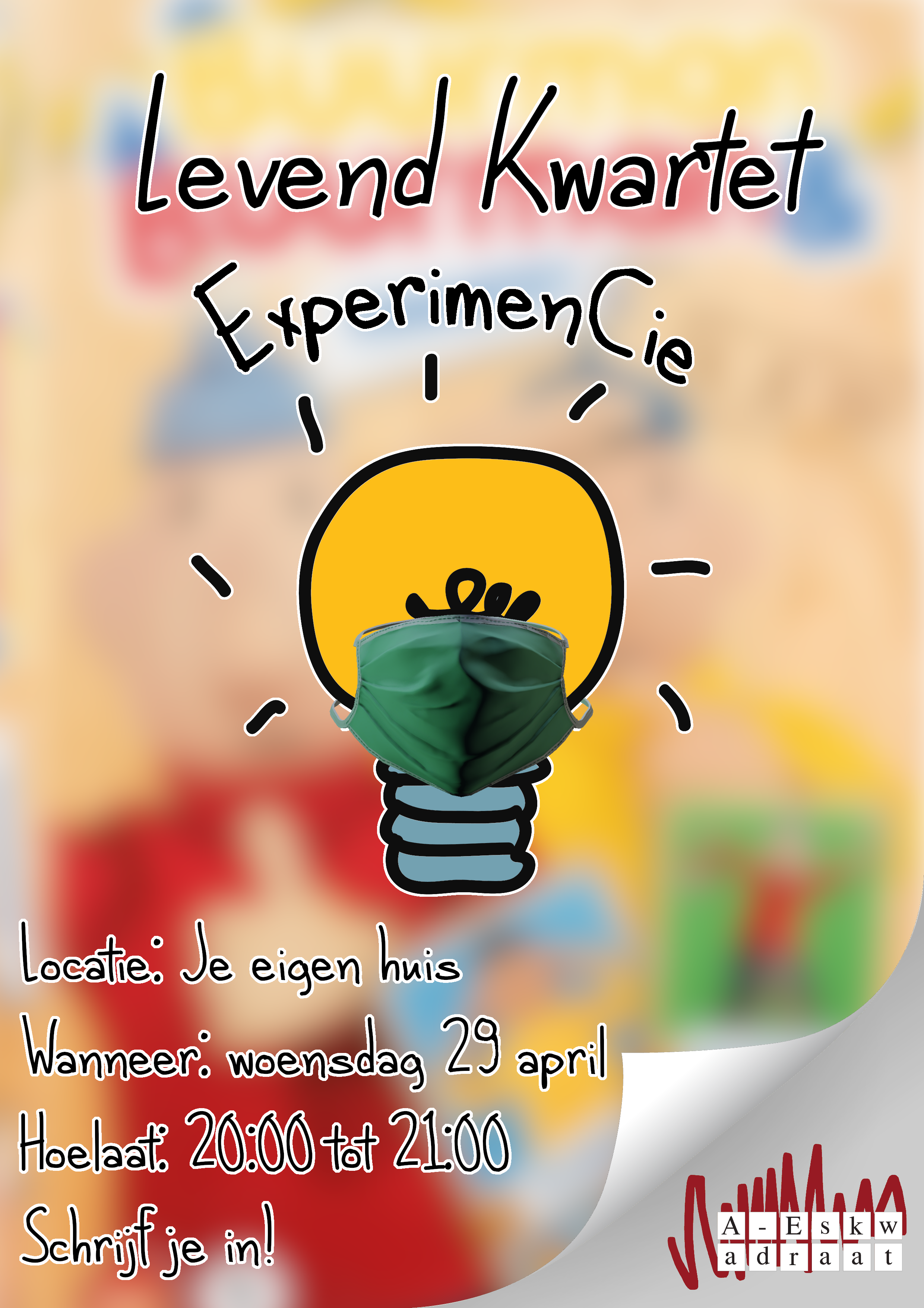 Hoe werkt levend kwartet nou? Het werkt als volgt: schrijf je in via https://forms.gle/azV22uFCuRVfJcay8 met alleen jezelf of (een deel van) een team (max 4 pers.) We zullen dan woensdag whatsappgroepen aanmaken per team. Om stipt 20:00 zal er een lijst met kwartet-objecten in de groep worden gezet. Je hebt dan een uur de tijd om zoveel mogelijk kwartetten te verzamelen. Dit doe je door alle vier een foto te sturen van je hoofd + het kwartet-object (waterkoker/pjama/NOS journaal etc.) Voor elk kwartet krijgt je team een punt, het team met de meeste punten wint!