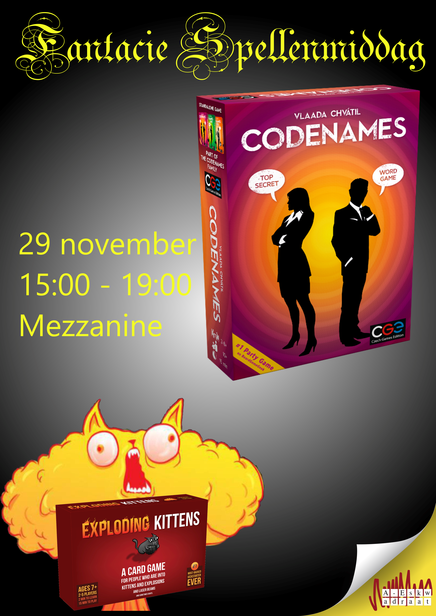 Geheime identiteiten en exploderende kittens. Dinsdag valt het allemaal te beleven tijdens de spellenmiddag in de mezzanine. Je mag uiteraard ook vrij spelen.