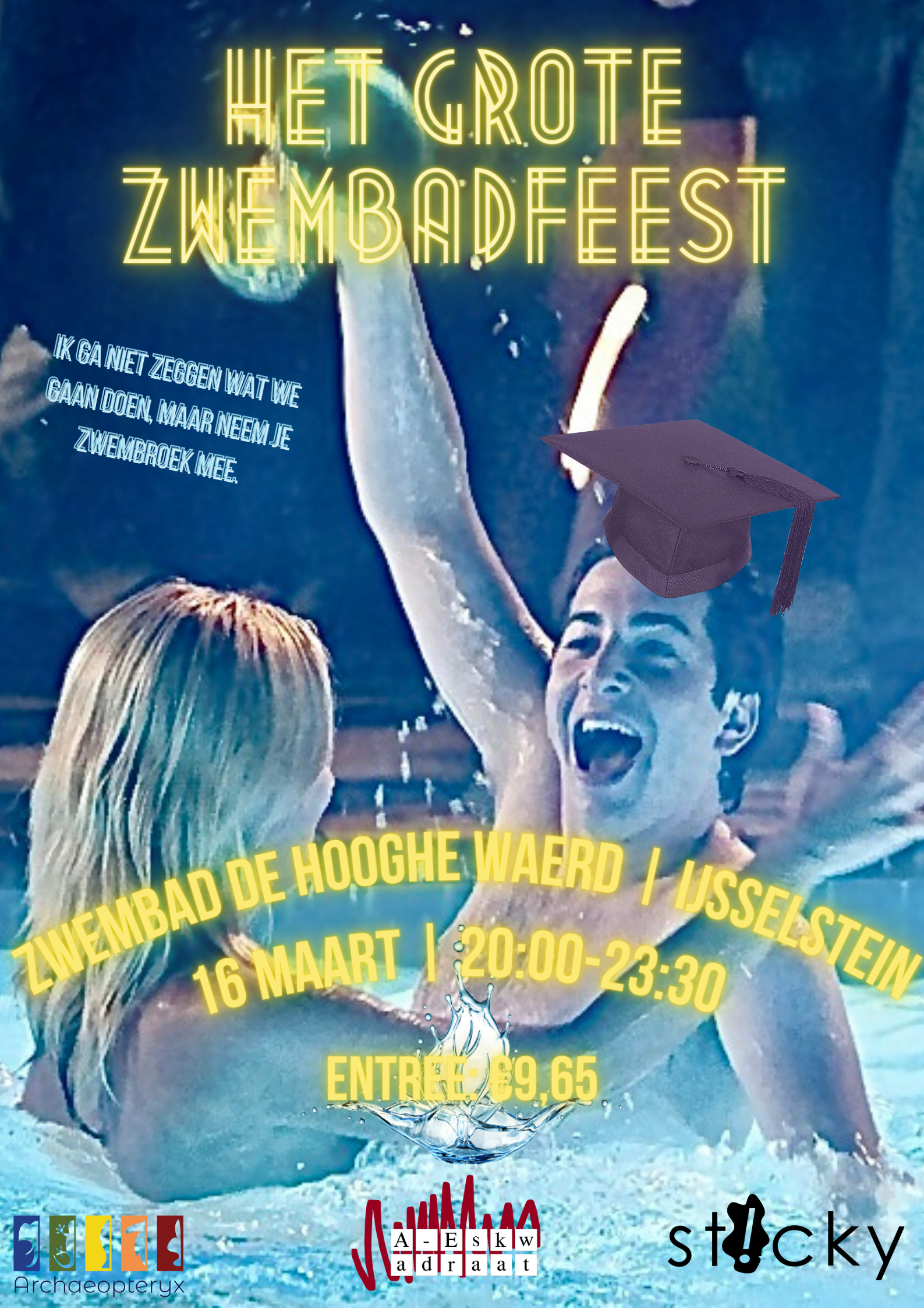 We're well into the new year, time for a splashy party! That's why the Feescie is organising, in cooperation with Sticky and Archaeopteryx: "The Big Pool Party". Are you excited to take off your clothes and get wet? Then you have come to the right place. The pool is located in IJsselstein, where you can travel easily by bus or tram. We start at 20.00, be there on time and bring your prettiest swimsuits. It is going to be an amazing night!