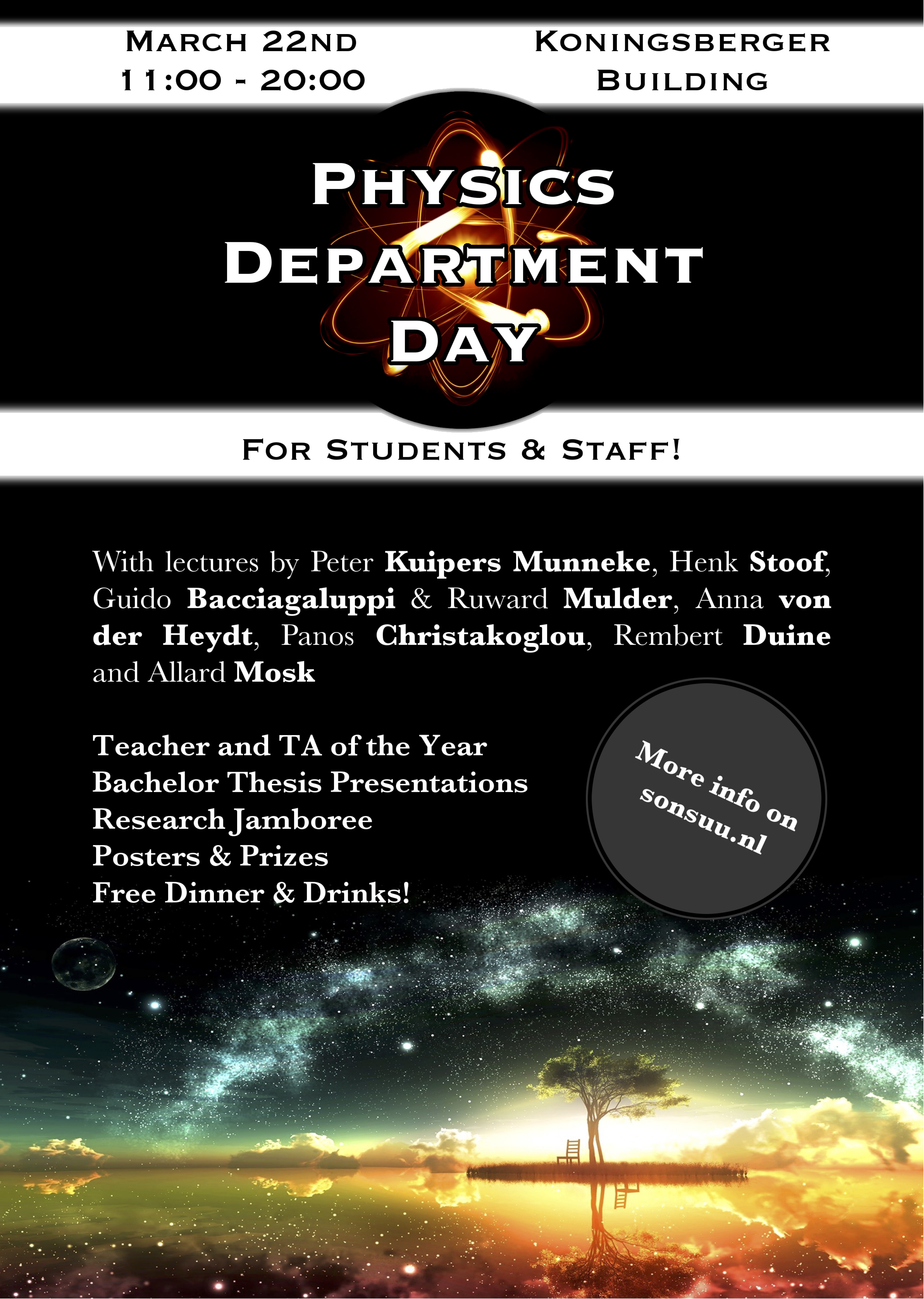De Departementsdag is een dag georganiseerd voor iedereen binnen het departement natuurkunde, zowel studenten als medewerkers. De invulling van de dag is dan ook erg divers: traditiegetrouw zullen er vanuit de verschillende instituten lezingen worden gegegeven, zullen de docent-van-het-jaar-prijzen worden uitgereikt, zullen er posterpresentaties zijn en zullen we de dag gezellig afsluiten met een borrel en een diner.