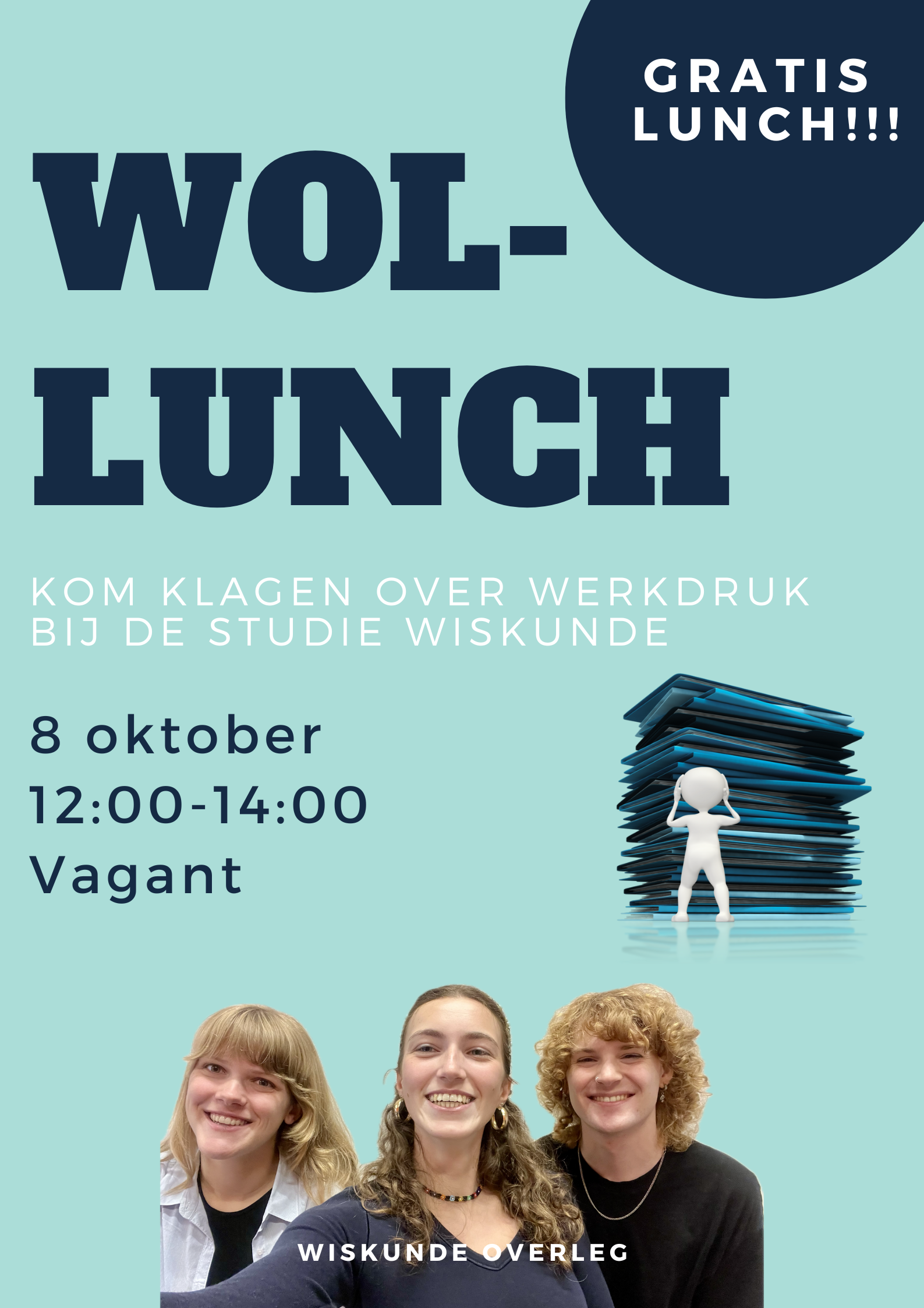 Hey, welkom bij de WOL-lunch! Kom gezellig samen met ons lunchen en houd even pauze van je studie. Vind jij de broodjes van de spar ook altijd te duur? Wij ook, dus we zorgen ervoor dat er ingredienten zijn om zelf je belegde broodje te maken. Je mag gewoon komen binnenlopen tussen 12 & 14. En als we toch lekker aan het eten zijn, kan je bij ons gelijk al je klachten over de opleiding & je vakken kwijt. Wij geven het dan door aan het departement zodat we het kunnen verbeteren.