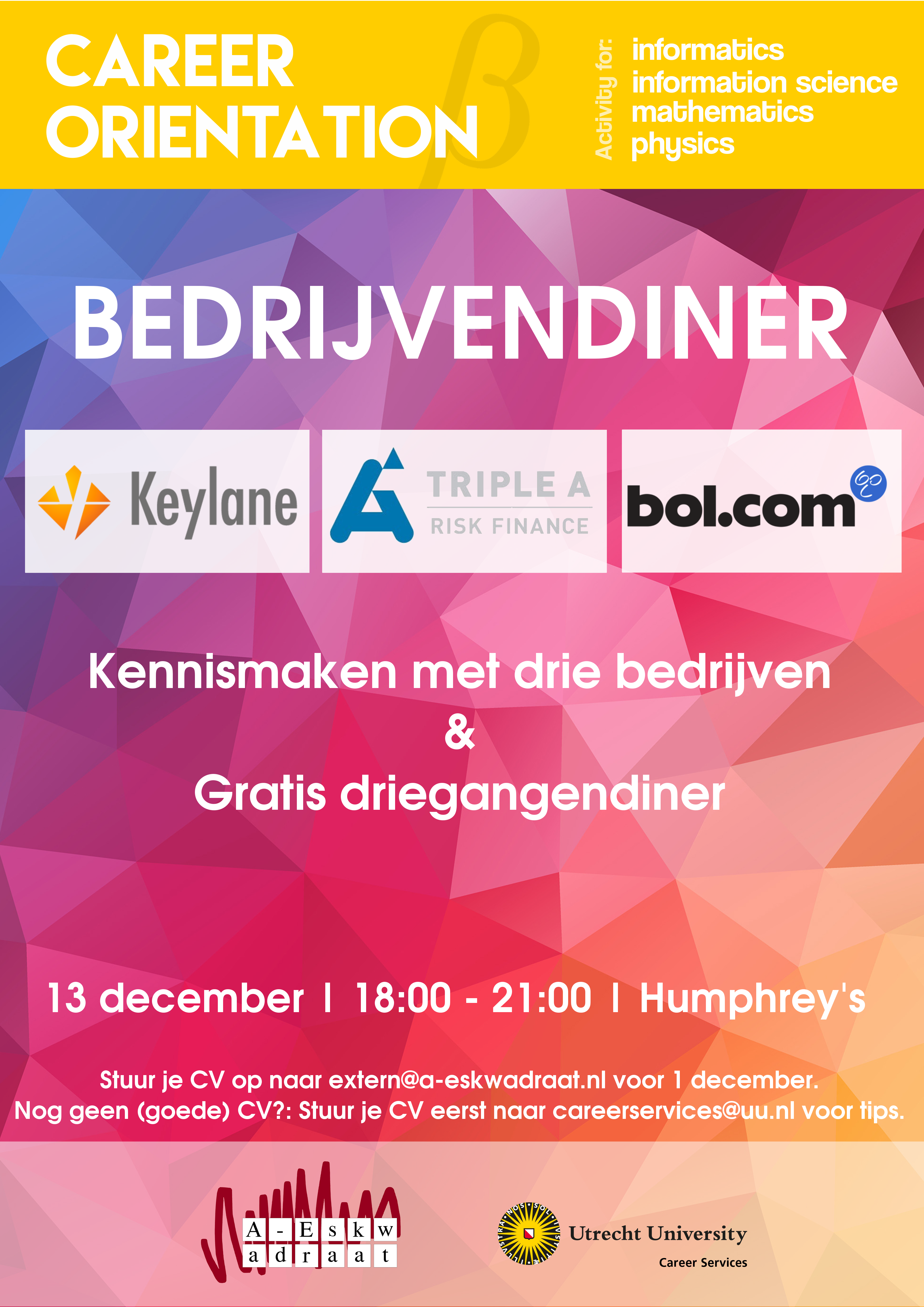 Do you want to get a bigger network? Do you want a free dinner in Utrecht? Join us 13 december in the centrum of Utrecht! A three course dinner at Humphreys, where you join each company at a different course. Ideal to get to know some companies and broaden your network.