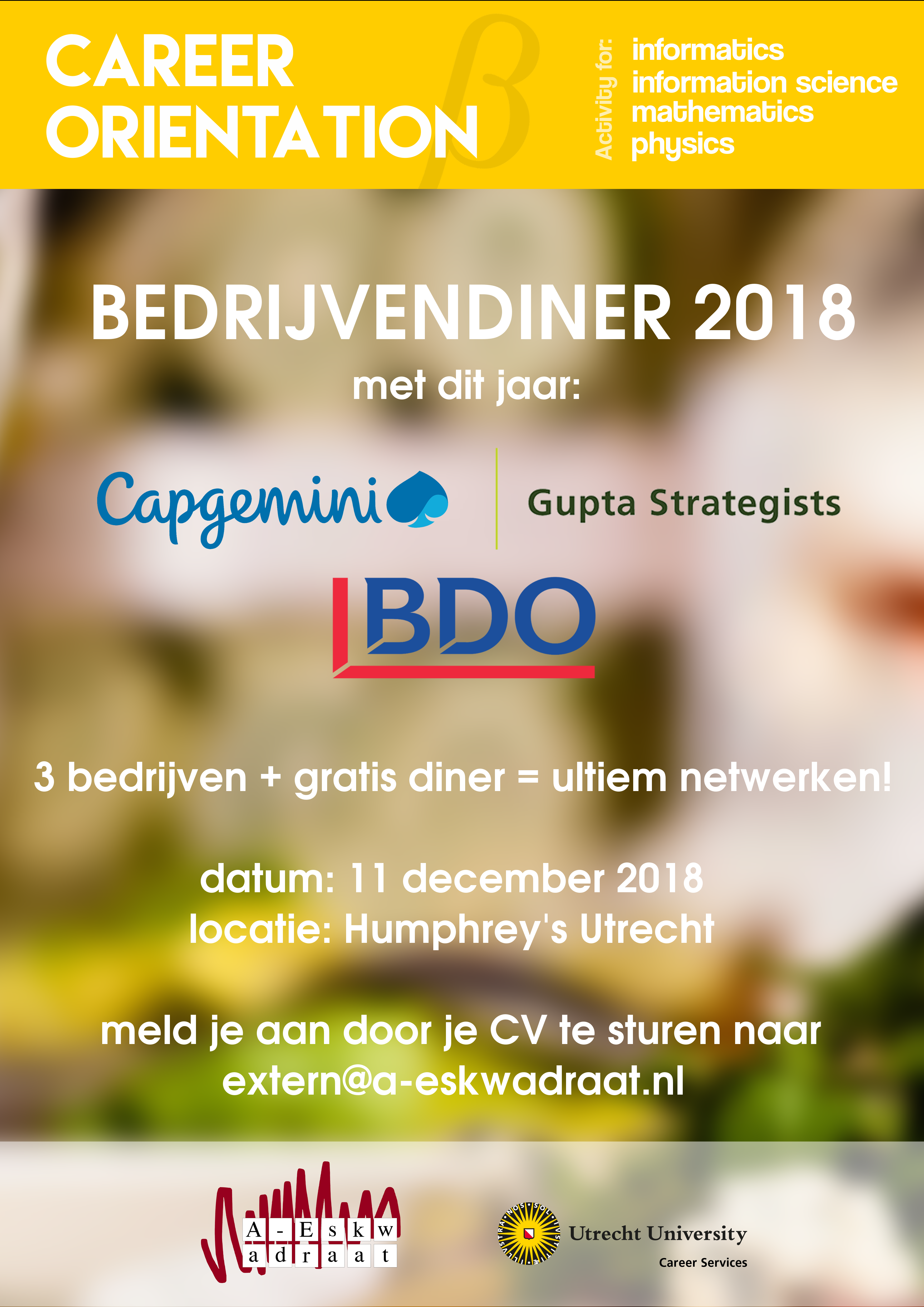 Would you like to sign up for this year's Business Dinner? Please send your CV to extern@a-eskwadraat.nl before November 25th 23:59. Should your CV be selected, you will hear from us soon!