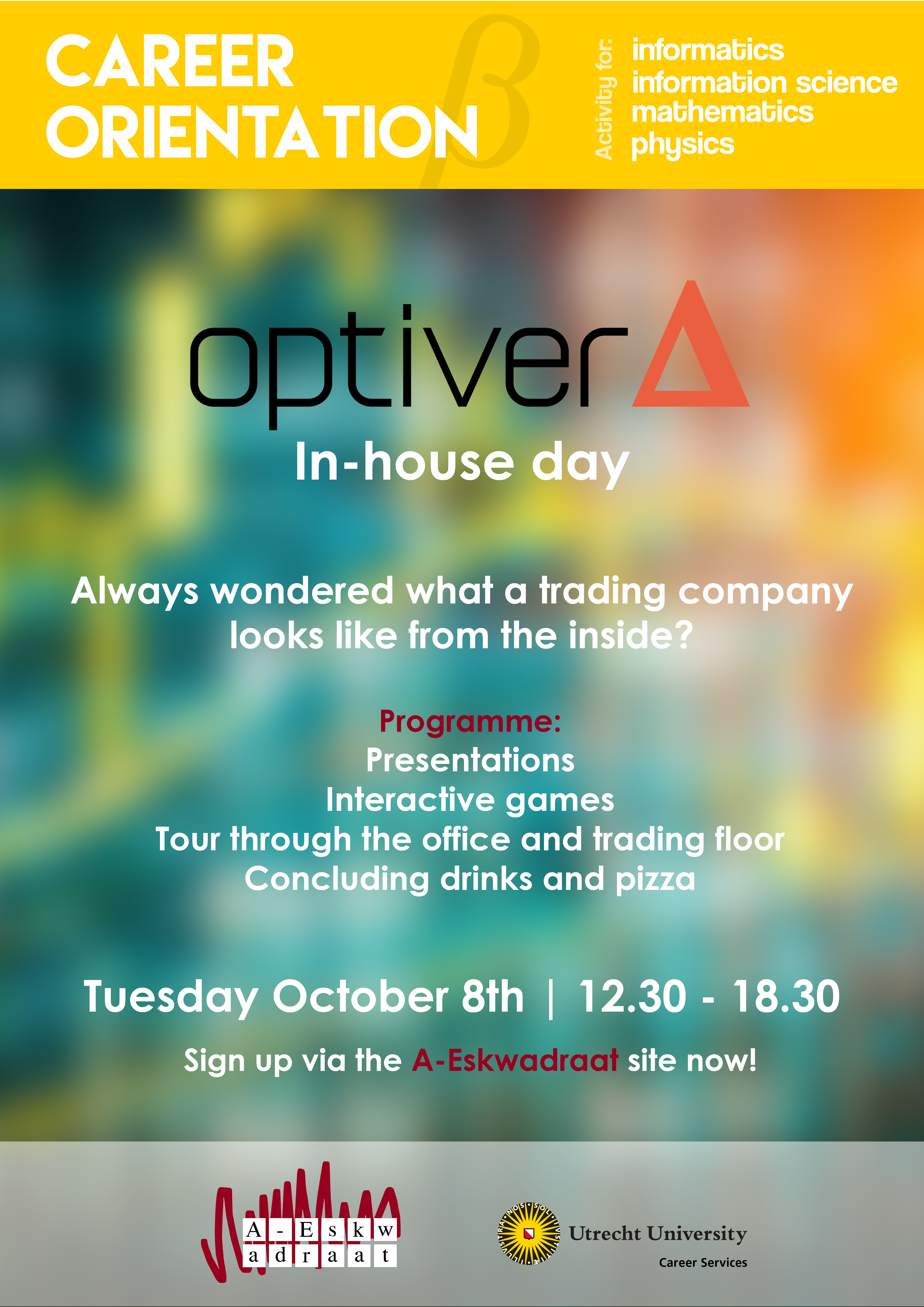 Tijdens de inhousedag van Optiver zullen we langsgaan op hun hoofdkantoor in Amsterdam, wat zeker een bezoekje waard is. Hier zullen we naast een presentatie ook interactieve games spelen en een tour krijgen door het kantoor waar we ook de trading floor te zien krijgen. De dag wordt afgesloten met een borrel en pizza!