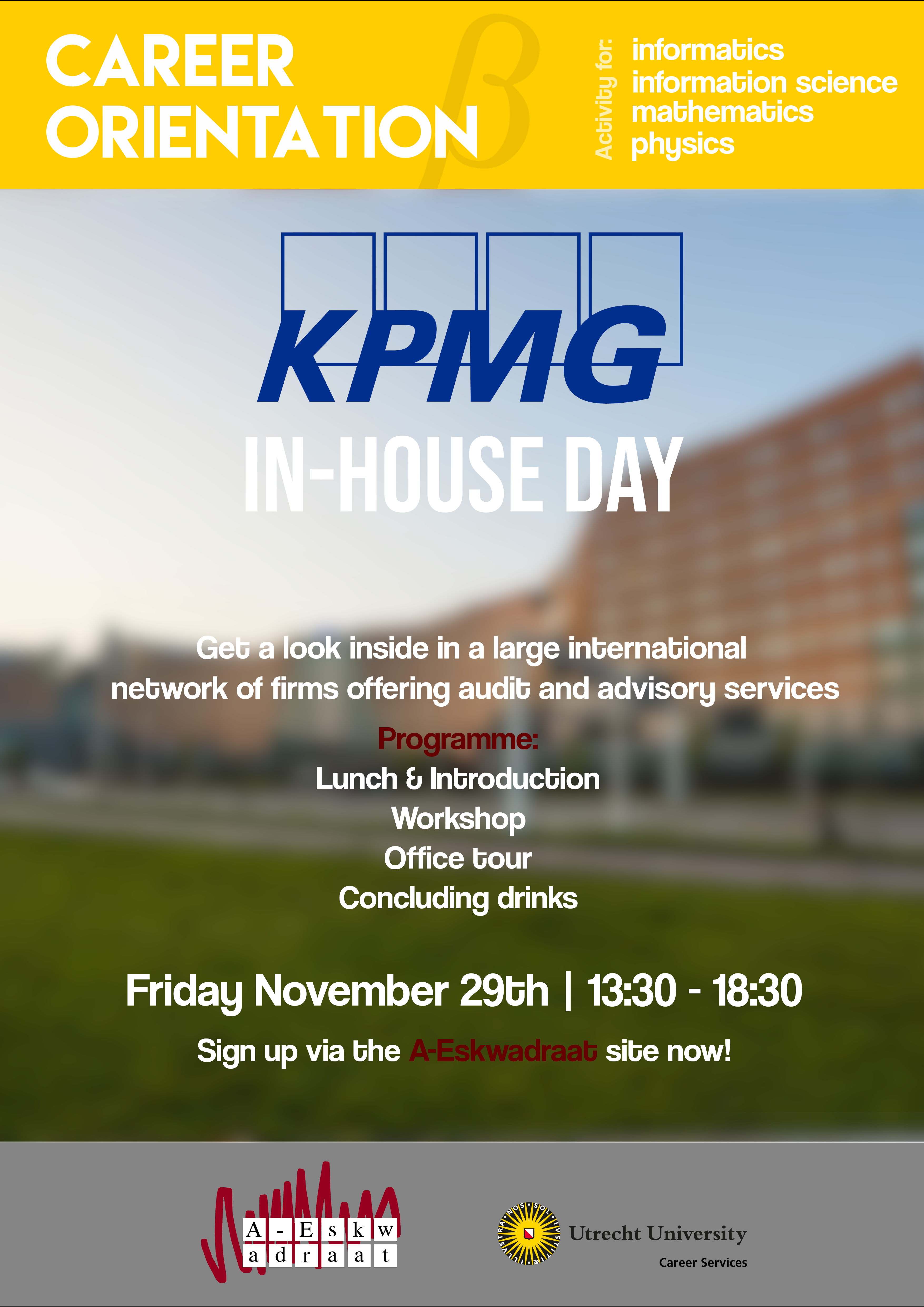 Join us when we visit one of the big four in accounting and financial consulting: KPMG. We will visit the main office in Amstelveen, where we will be welcomed around 13:30 for a nice lunch and an introduction. KPMG will then present a workshop about fraud detection and we will get a tour around the impressive office. We will conclude the day with some drinks around 17:00. Please register here if you want to join us and we will see you at November 29th!