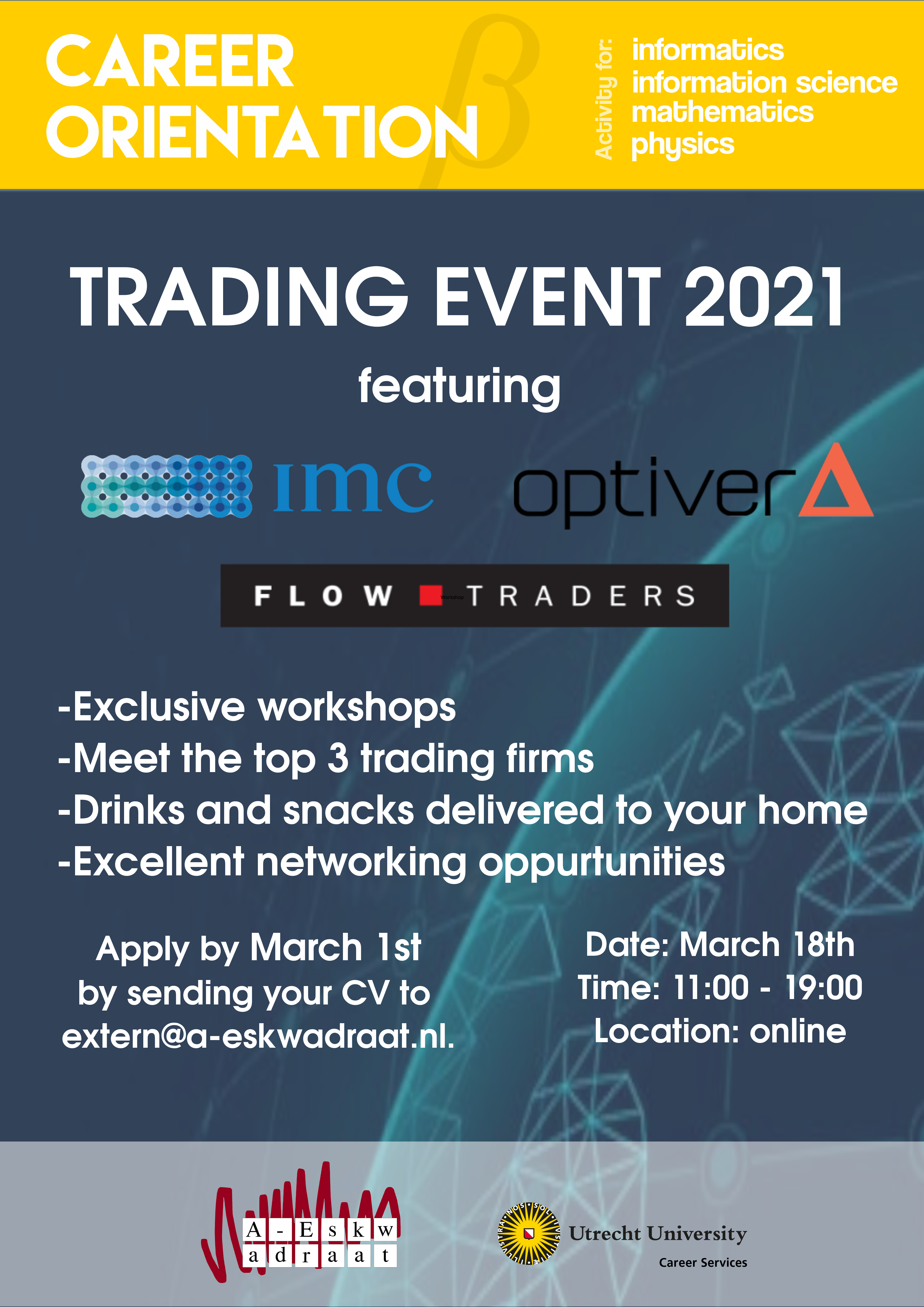 After the success of two years ago we will once again be organising a Trading Event in collaboration with three of the largest trading firms of the Netherlands: OptiverFlow Traders and IMC. This event will give help you get a better view of this intriguing field.