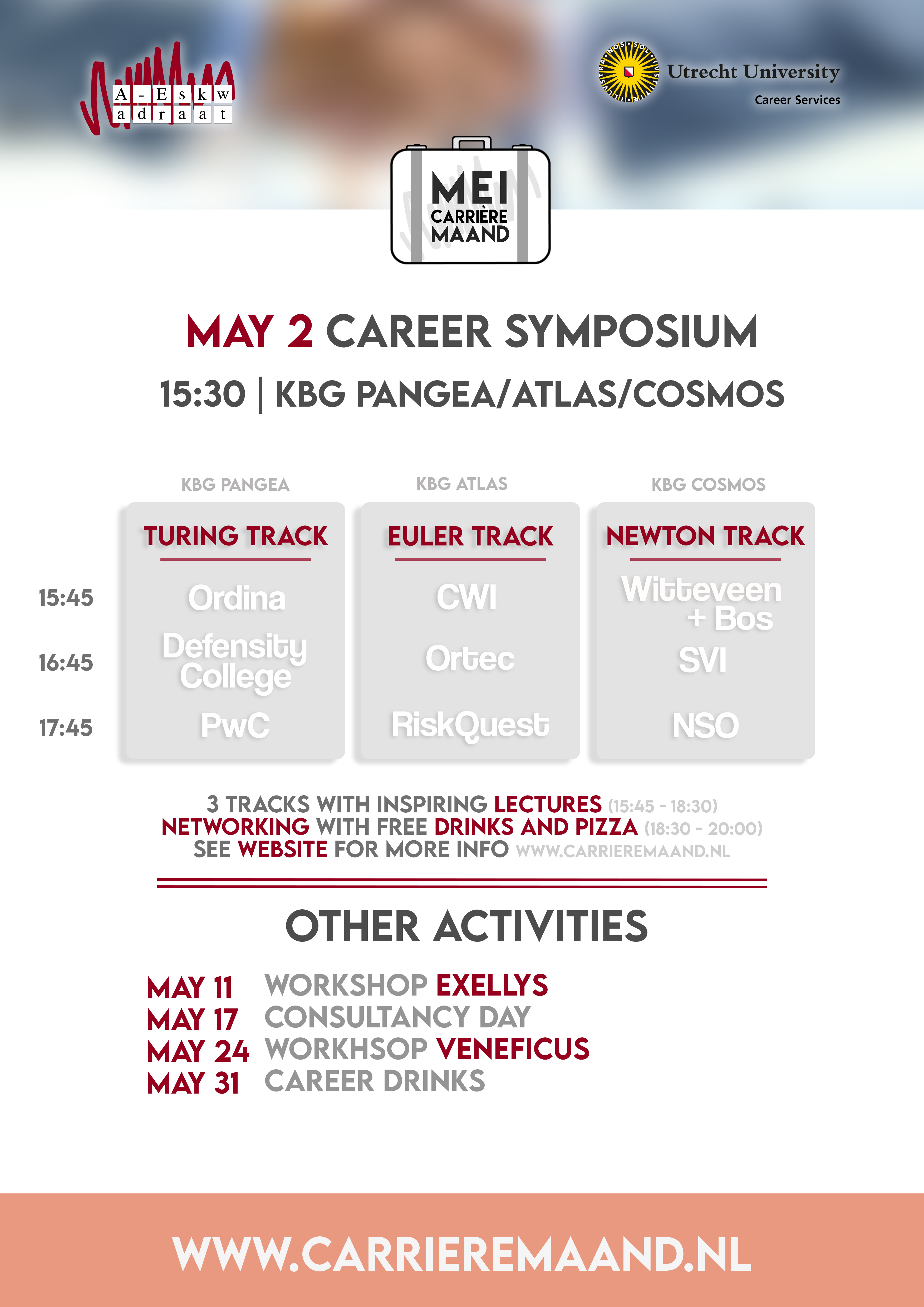 On the 2nd of may, the yearly Career Symposium will happen, with 3 tracks, 3 rounds and 9 companies coming to us to give a talk on what they do, and what you can do at their company. There will be free drinks en pizza after, plus a CV check with Simone Kastelein of Career Services.