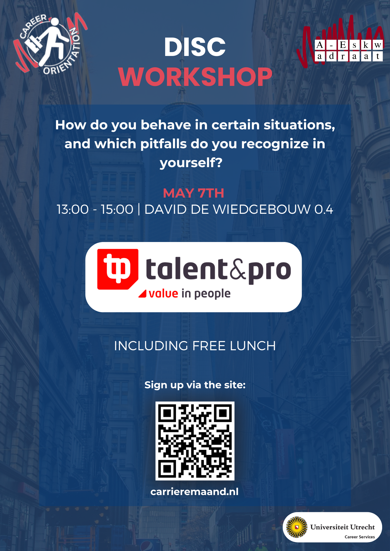 During the workshop, we will start with a brief introduction to Talent&Pro: who we are and what we do. Then, we’ll dive into the DISC model together through an interactive session. With thought-provoking questions, you’ll discover your preferred style and how it manifests. After that, you’ll have a conversation with someone who has a different style. This not only fosters greater understanding of others, but also provides valuable insights that will help you collaborate better with, for example, your (study) colleagues.