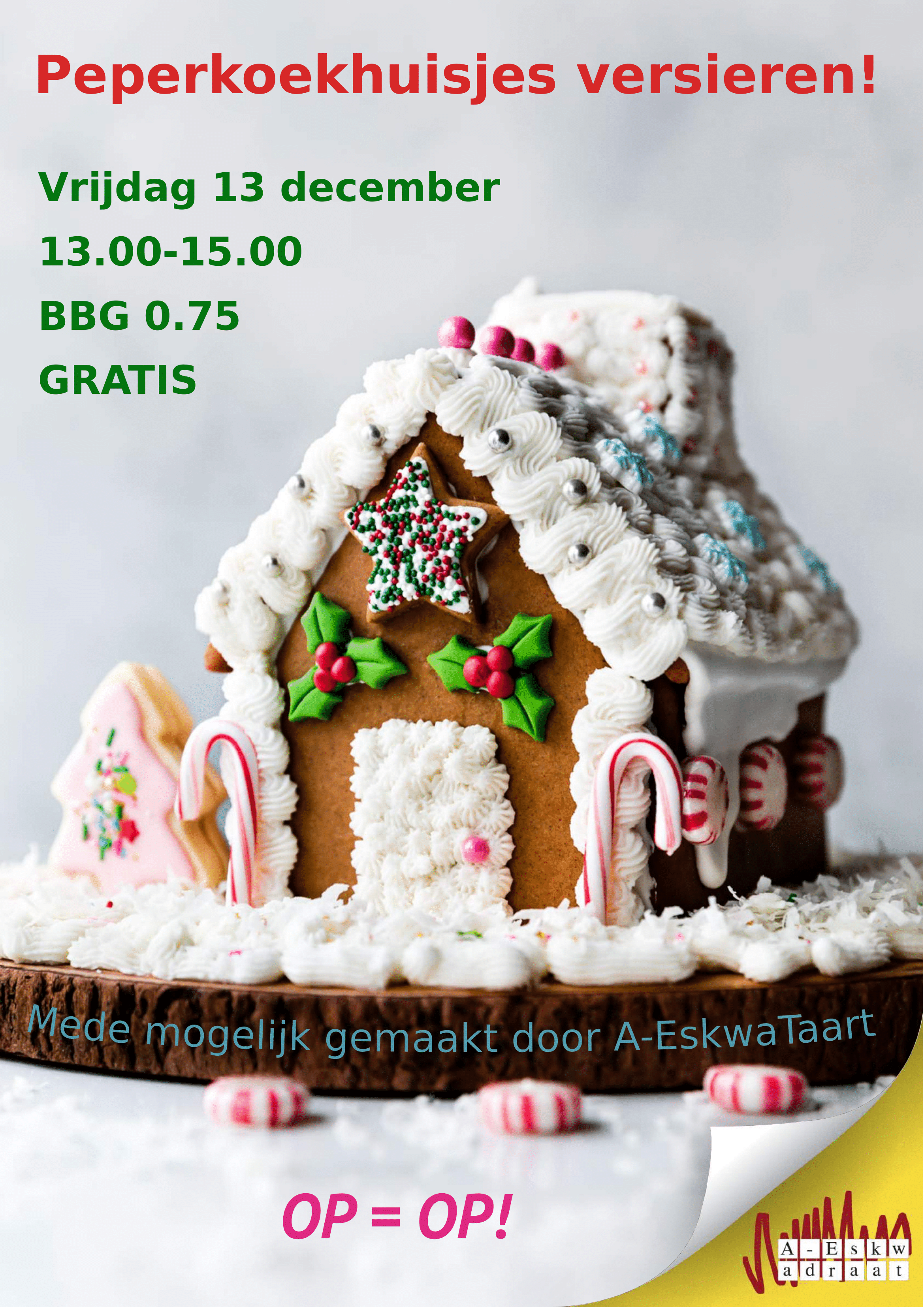 De dagen worden koud, nat en donker. Dus om iedereen alvast een beetje in de kerststemming te krijgen gaan we gezellig peperkoekhuisjes versieren! Leef je helemaal uit op het bouwen en versieren van je eigen huisje, of ontwerp juist samen met iemand je droomhuis. Natuurlijk mag je ze daarna mee naar huis nemen (of direct opeten). Maar wees er snel bij want OP=OP!