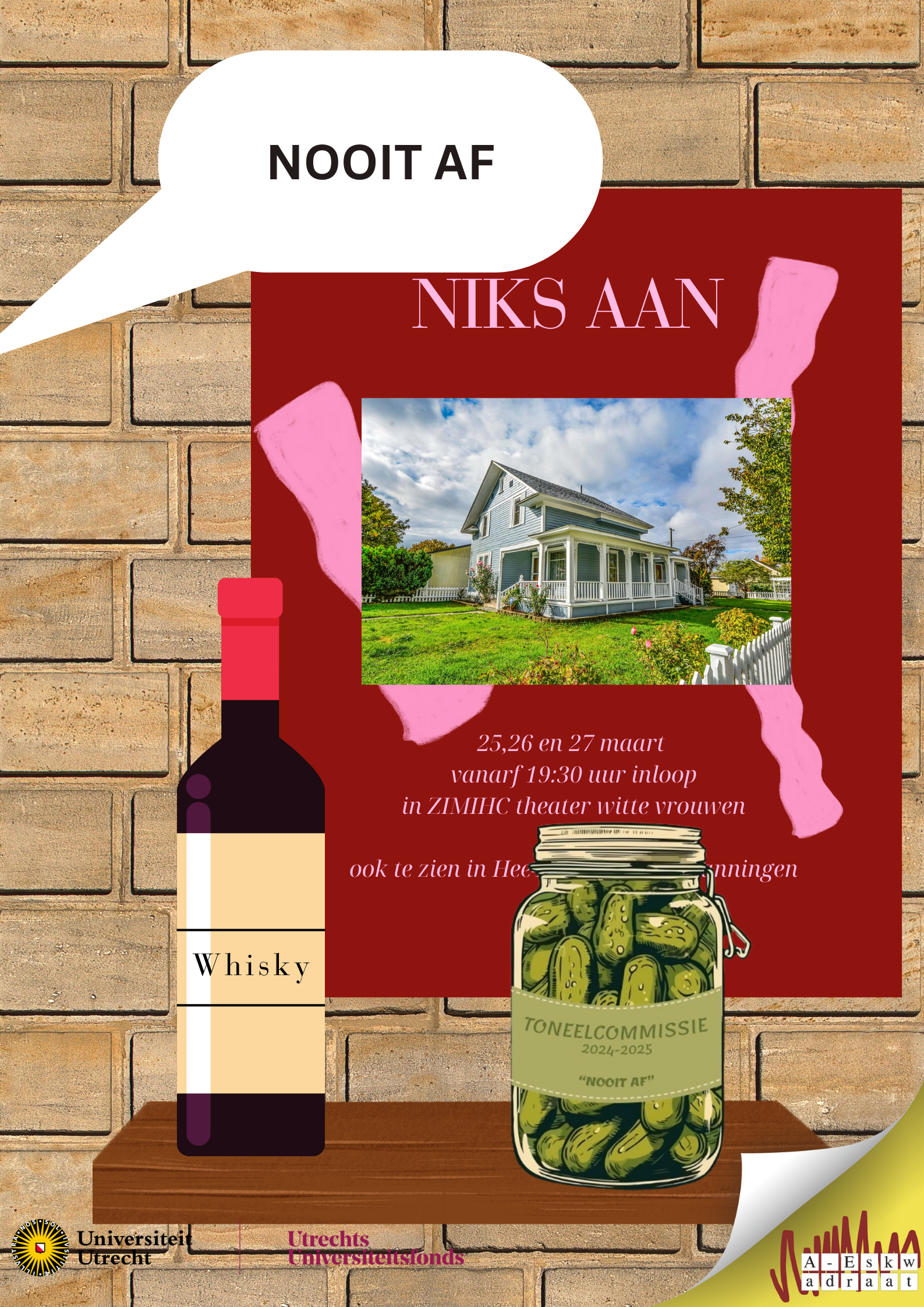 Het is weer zover: de jaarlijkse voorstelling van A-es is er weer. Dit jaar spelen we het stuk "Nooit Af". Dit stuk gaat over een toneelstuk in een toneelstuk waar van alles misgaat door de unieke karakters van de spelers en... Vier borden augurken in de eerst acte alleen al!. Het wordt lachen, gieren, brullen! Kom dus gezellig kijken 25,26 of 27 maart. De inloop is vanaf 19:30 en vergeet niet kaartjes te kopen!